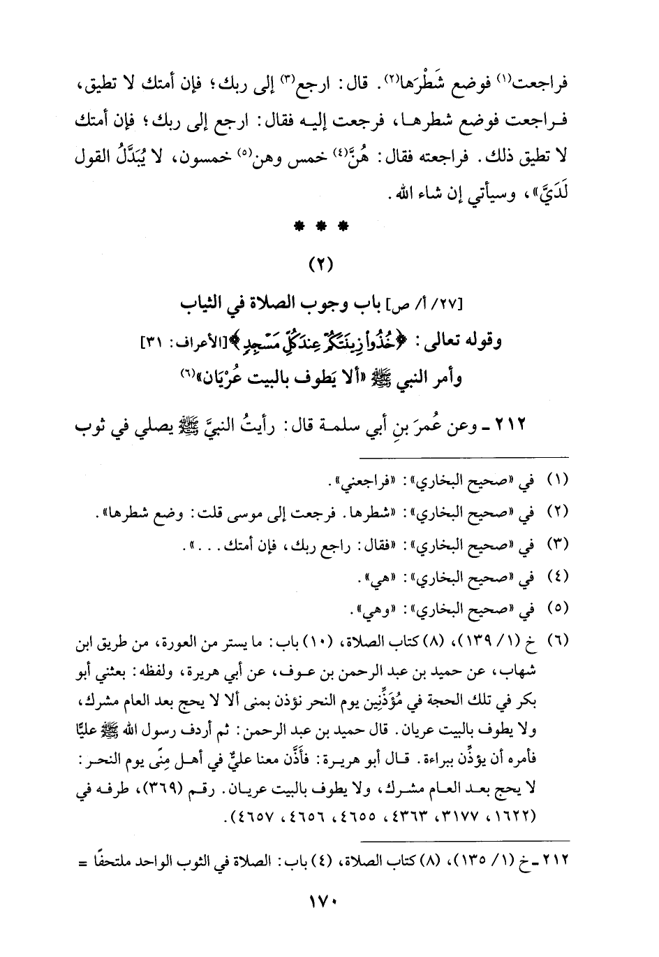 (2) باب وجوب الصلاة في الثياب وقوله تعالى: {خُذُوا زِينَتَكُمْ عِنْدَ كُلِّ مَسْجِدٍ} [الأعراف: 31] وأمر النبي -صلى اللَّه عليه وسلم- "ألا يَطوف بالبيت عُرْيَان" (¬6)