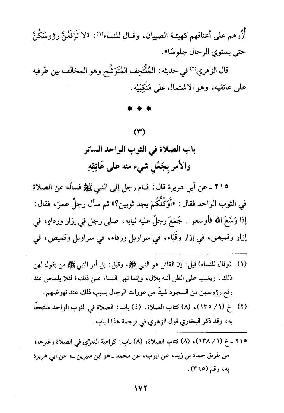 215 - عن أبي هريرة قال: قام رجل إلى النبي -صلى اللَّه عليه وسلم- فسأله عن الصلاة في الثوب الواحد فقال: "أَوَكُلُّكُمْ يجد ثوبين؟ " ثم سأل رجلٌ عمرَ، فقال: إذا وَسَّعَ اللَّه فأوسعوا. جَمَعَ رجلٌ عليه ثيابه، صلى رجل في إزار ورداءٍ، في إزار وقميص، في إزار وقَبَاء، في سراويل ورداء، في سراويل وقميص، في