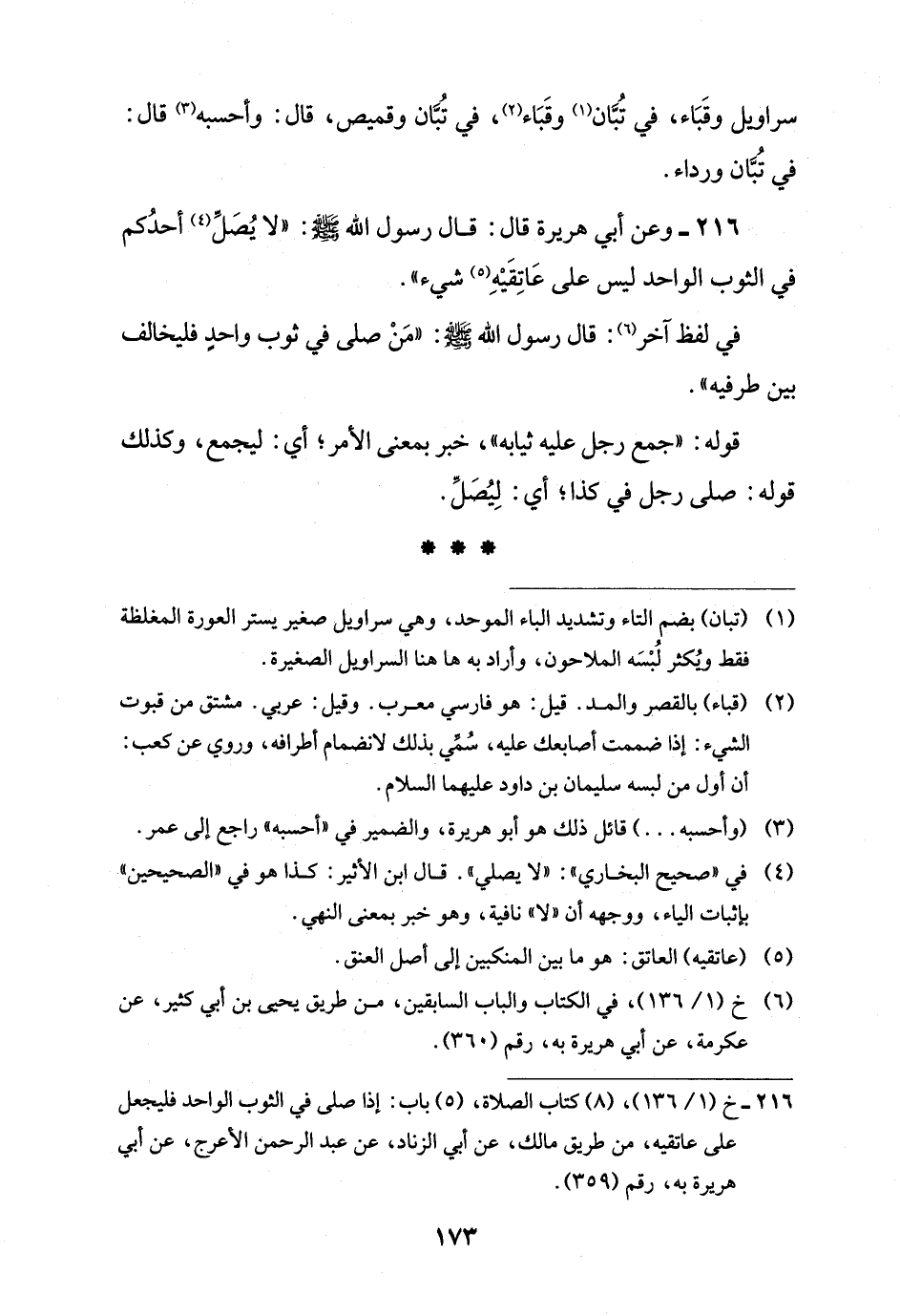 216 - خ (1/ 136)، (8) كتاب الصلاة، (5) باب: إذا صلى في الثوب الواحد فليجعل على عاتقيه، من طريق مالك، عن أبي الزناد، عن عبد الرحمن الأعرج، عن أبي هريرة به، رقم (359).