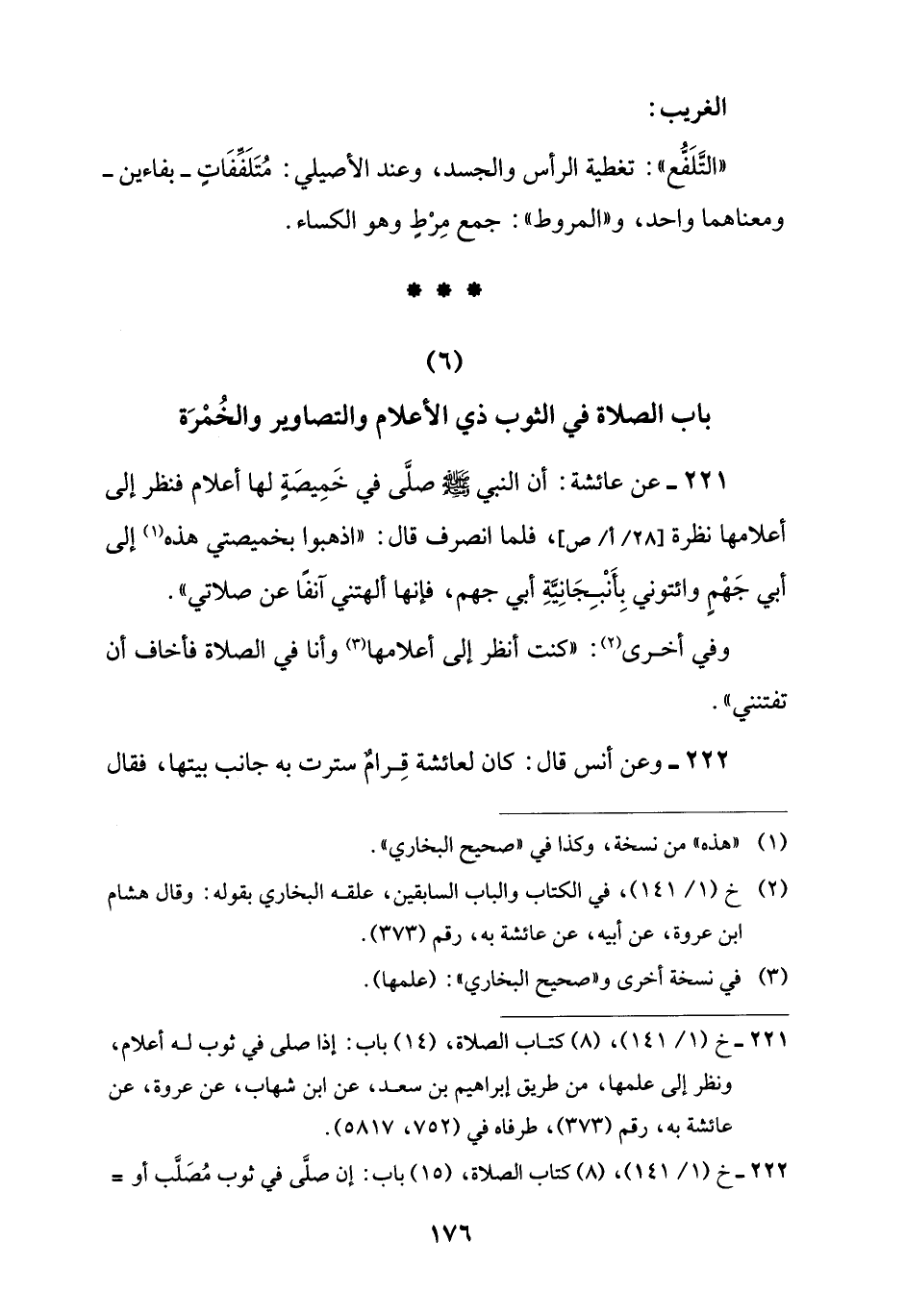 221 - خ (1/ 141)، (8) كتاب الصلاة، (14) باب: إذا صلى في ثوب له أعلام، ونظر إلى علمها، من طريق إبراهيم بن سعد، عن ابن شهاب، عن عروة، عن عائشة به، رقم (373)، طرفاه في (752، 5817).