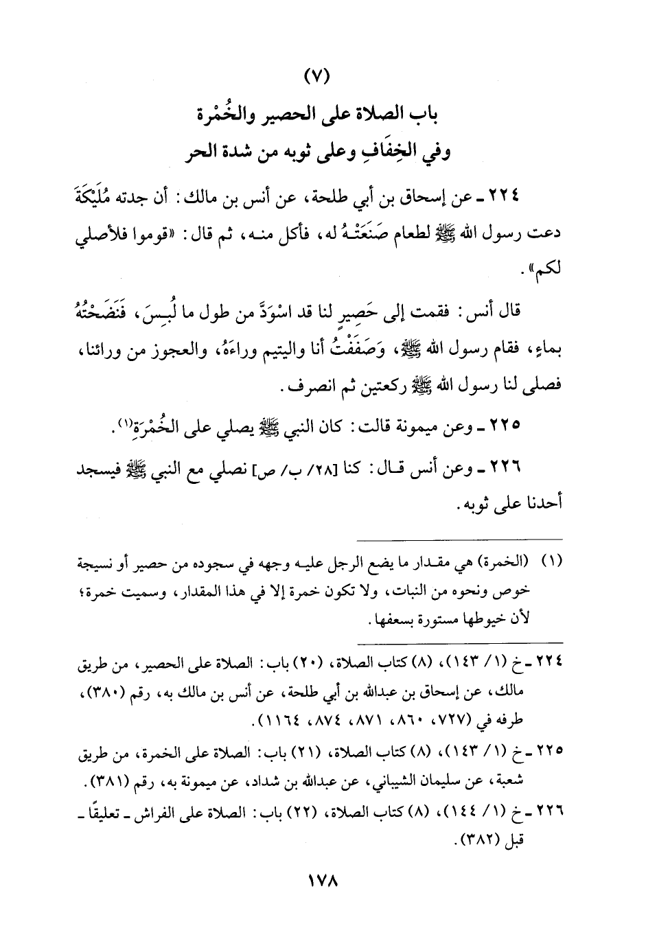 224 - خ (1/ 143)، (8) كتاب الصلاة، (20) باب: الصلاة على الحصير، من طريق مالك، عن إسحاق بن عبد اللَّه بن أبي طلحة، عن أنس بن مالك به، رقم (380)، طرفه في (727، 860، 871، 874، 1164).