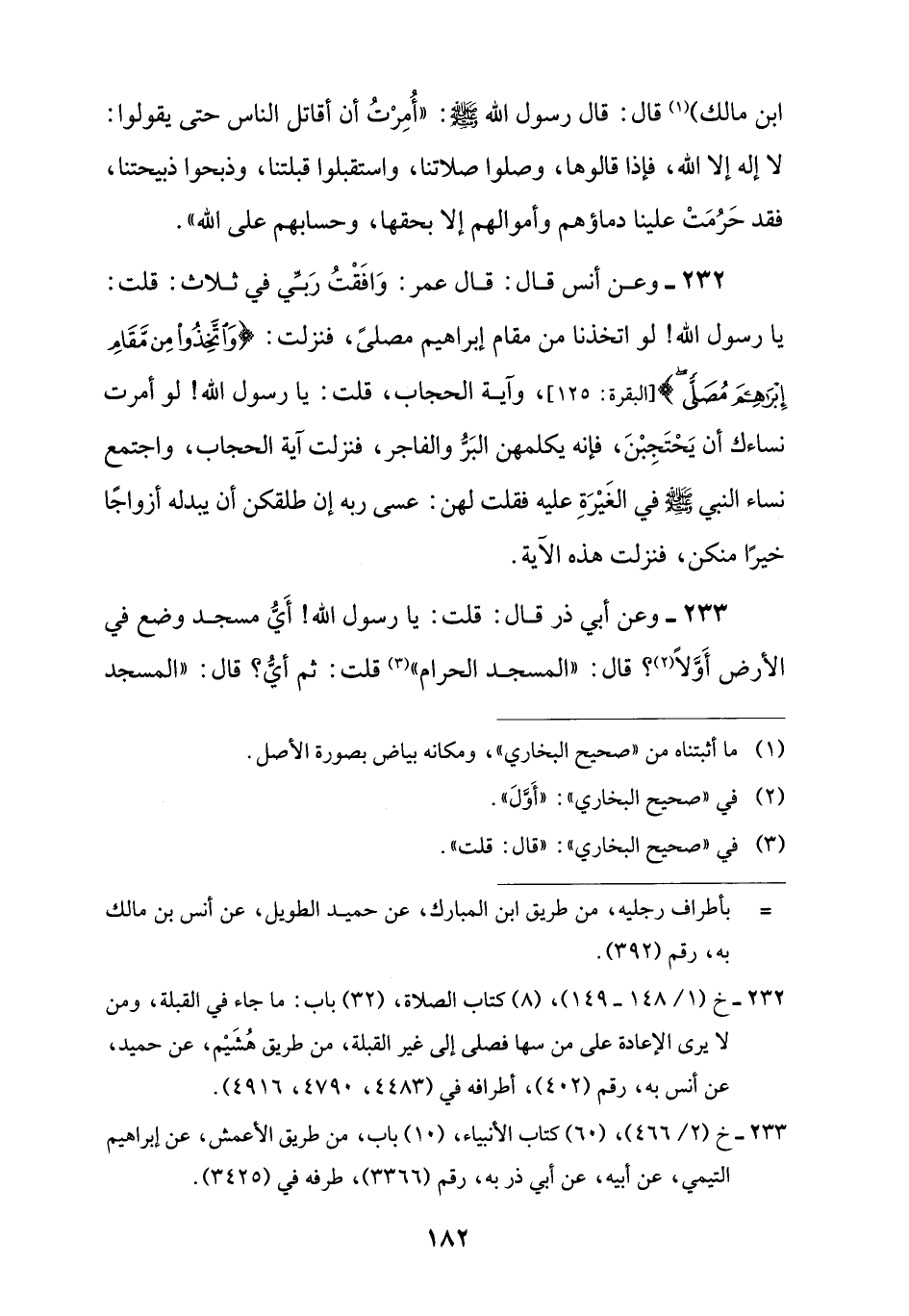 232 - خ (1/ 148 - 149)، (8) كتاب الصلاة، (32) باب: ما جاء في القبلة، ومن لا يرى الإعادة على من سها فصلى إلى غير القبلة، من طريق هُشَيْم، عن حميد، عن أنس به، رقم (402)، أطرافه في (4483، 4795، 4916).