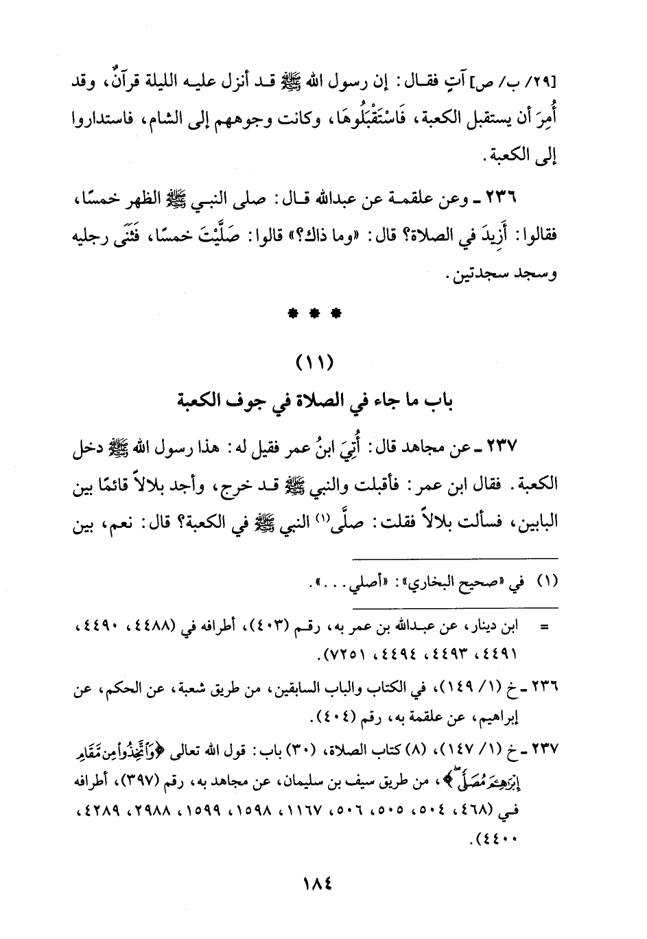 237 - عن مجاهد قال: أُتِيَ ابنُ عمر فقيل له: هذا رسول اللَّه -صلى اللَّه عليه وسلم- دخل الكعبة. فقال ابن عمر: فأقبلت والنبي -صلى اللَّه عليه وسلم- قد خرج، وأجد بلالًا قائمًا بين البابين، فسألت بلالًا فقلت: صلَّى (¬1) النبي -صلى اللَّه عليه وسلم- في الكعبة؟ قال: نعم، بين