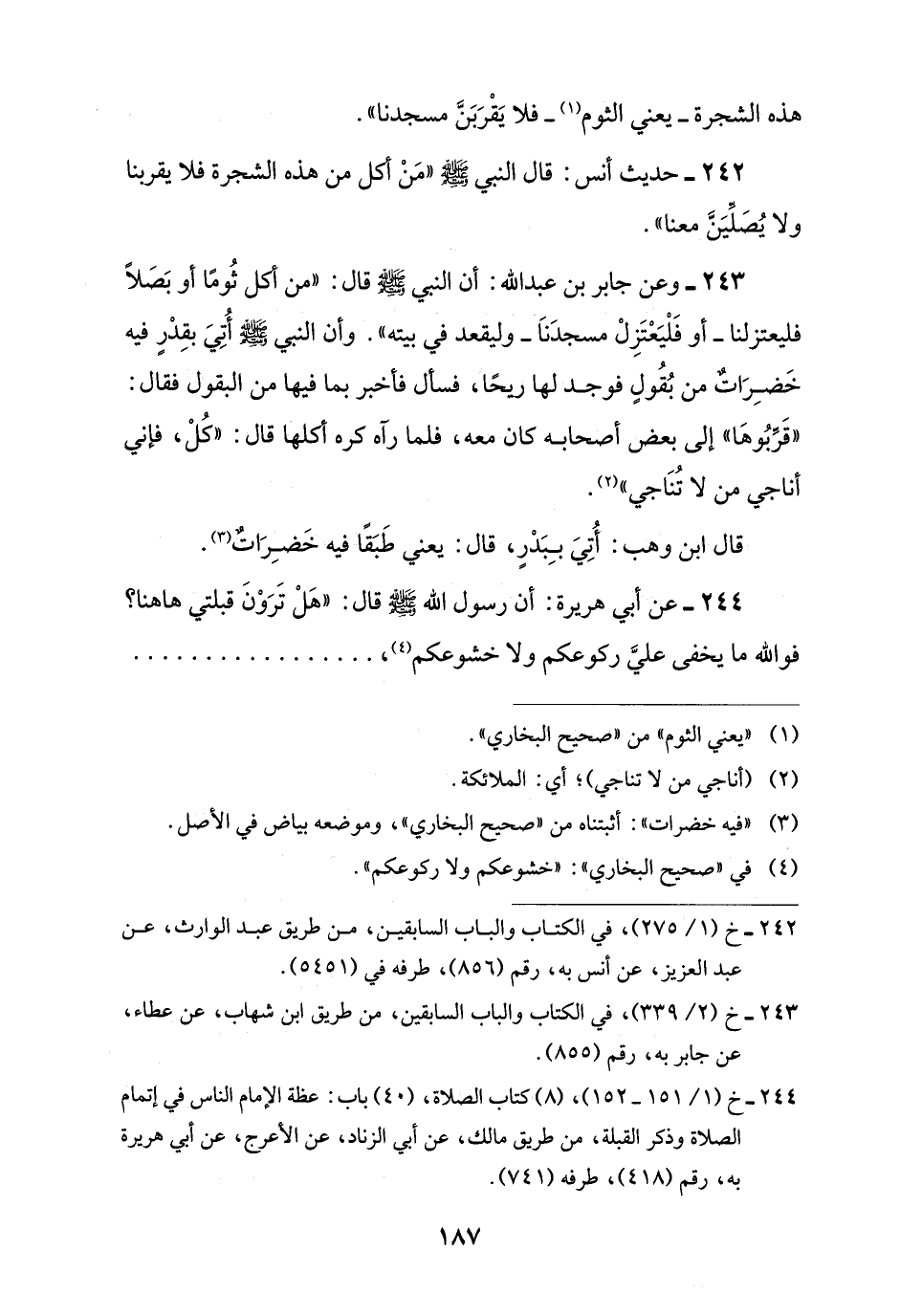 242 - حديث أنس: قال النبي -صلى اللَّه عليه وسلم- "مَنْ أكل من هذه الشجرة فلا يقربنا ولا يُصَلِّيَنَّ معنا".