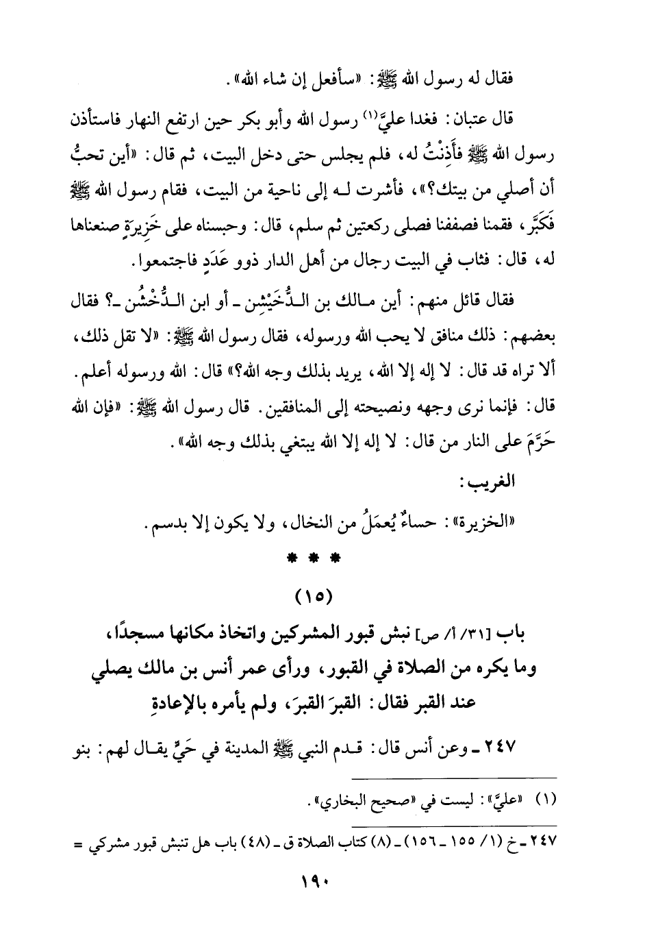 (15) باب نبش قبور المشركين واتخاذ مكانها مسجدًا، وما يكره من الصلاة في القبور، ورأى عمر أنس بن مالك يصلي عند القبر فقال: القبرَ القبرَ، ولم يأمره بالإعادةِ