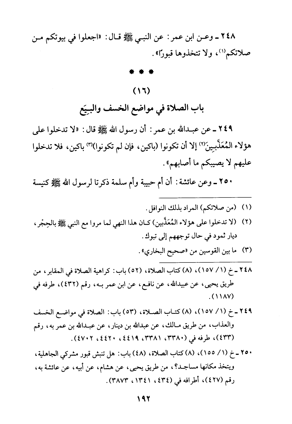249 - خ (1/ 157)، (8) كتاب الصلاة، (53) باب: الصلاة في مواضع الخسف والعذاب، من طريق مالك، عن عبد اللَّه بن دينار، عن عبد اللَّه بن عمر به، رقم (433)، طرفه في (3385، 3381، 4419، 4420، 4702).