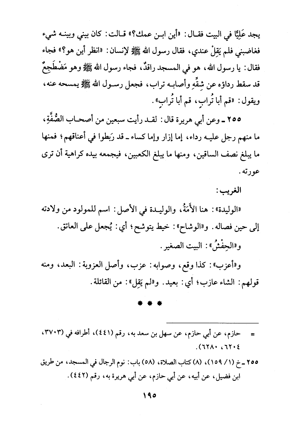 255 - خ (1/ 159)، (8) كتاب الصلاة، (58) باب: نوم الرجال في المسجد، من طريق ابن فضيل، عن أبيه، عن أبي حازم، عن أبي هريرة به، رقم (442).