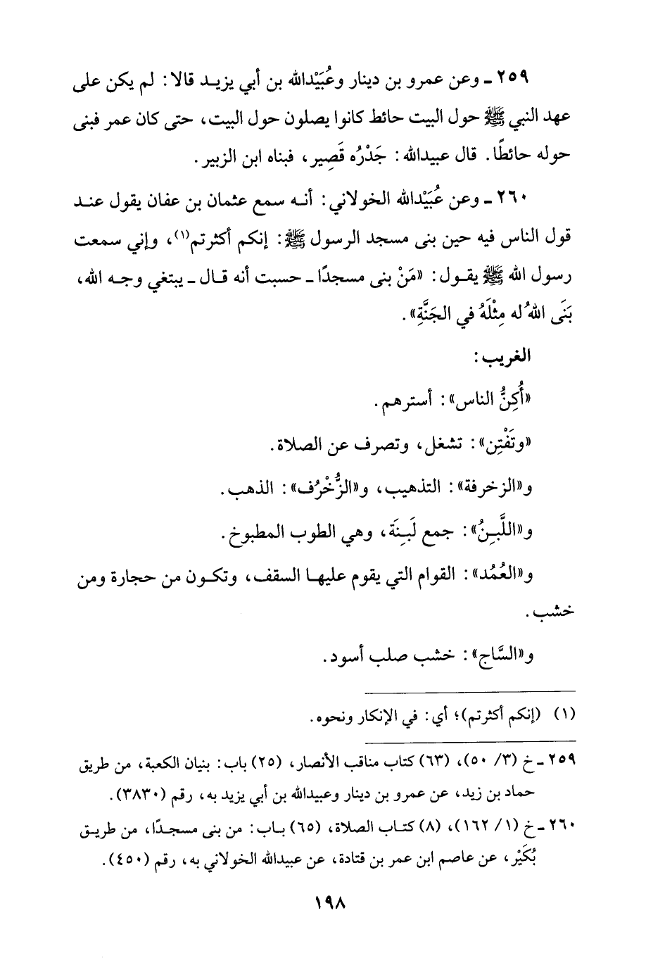 259 - وعن عمرو بن دينار وعُبَيْد اللَّه بن أبي يزيد قالا: لم يكن على عهد النبي -صلى اللَّه عليه وسلم- حول البيت حائط كانوا يصلون حول البيت، حتى كان عمر فبنى حوله حائطًا. قال عبيد اللَّه: جَدْرُه قَصير، فبناه ابن الزبير.
