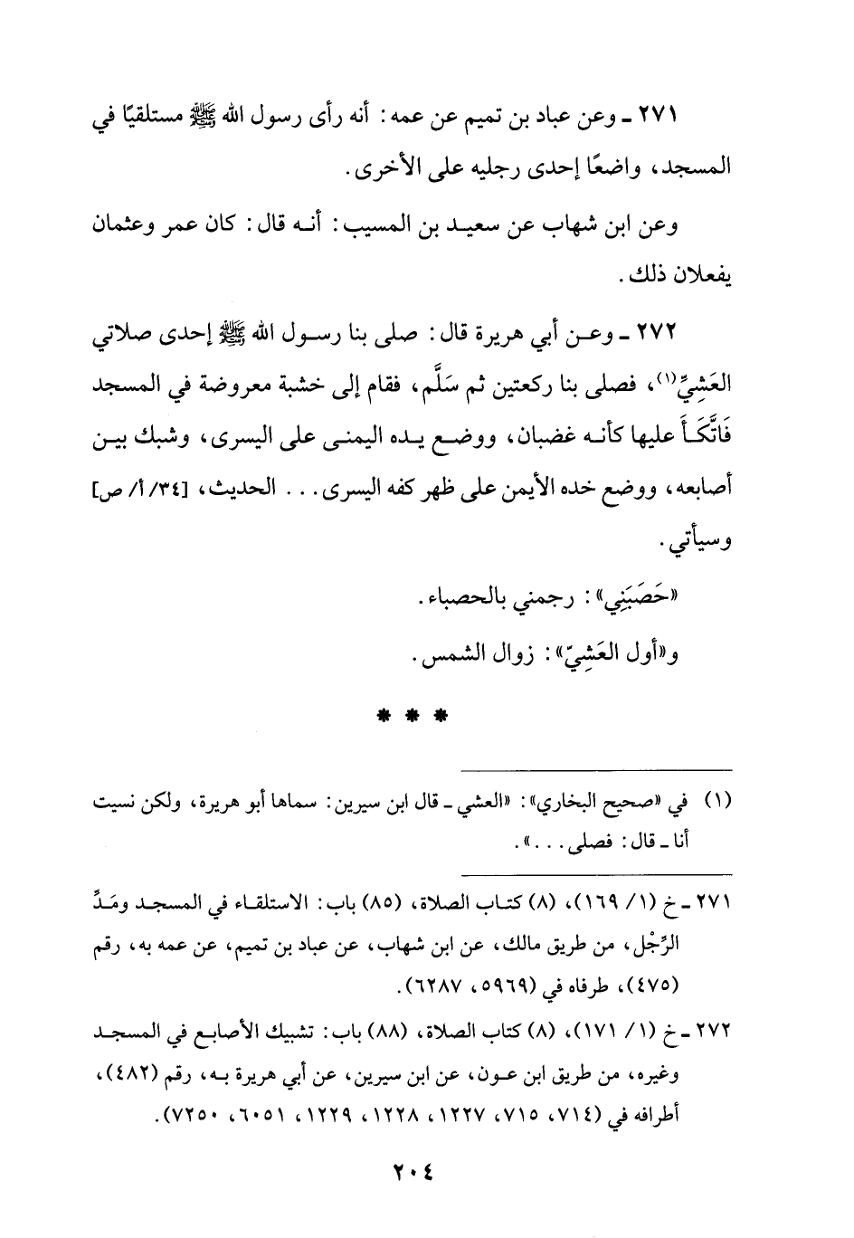 272 - وعن أبي هريرة قال: صلى بنا رسول اللَّه -صلى اللَّه عليه وسلم- إحدى صلاتي العَشِيِّ (¬1)، فصلى بنا ركعتين ثم سَلَّم، فقام إلى خشبة معروضة في المسجد فَاتَّكَأَ عليها كأنه غضبان، ووضع يده اليمنى على اليسرى، وشبك بين أصابعه، ووضع خده الأيمن على ظهر كفه اليسرى. . . الحديث، وسيأتي.