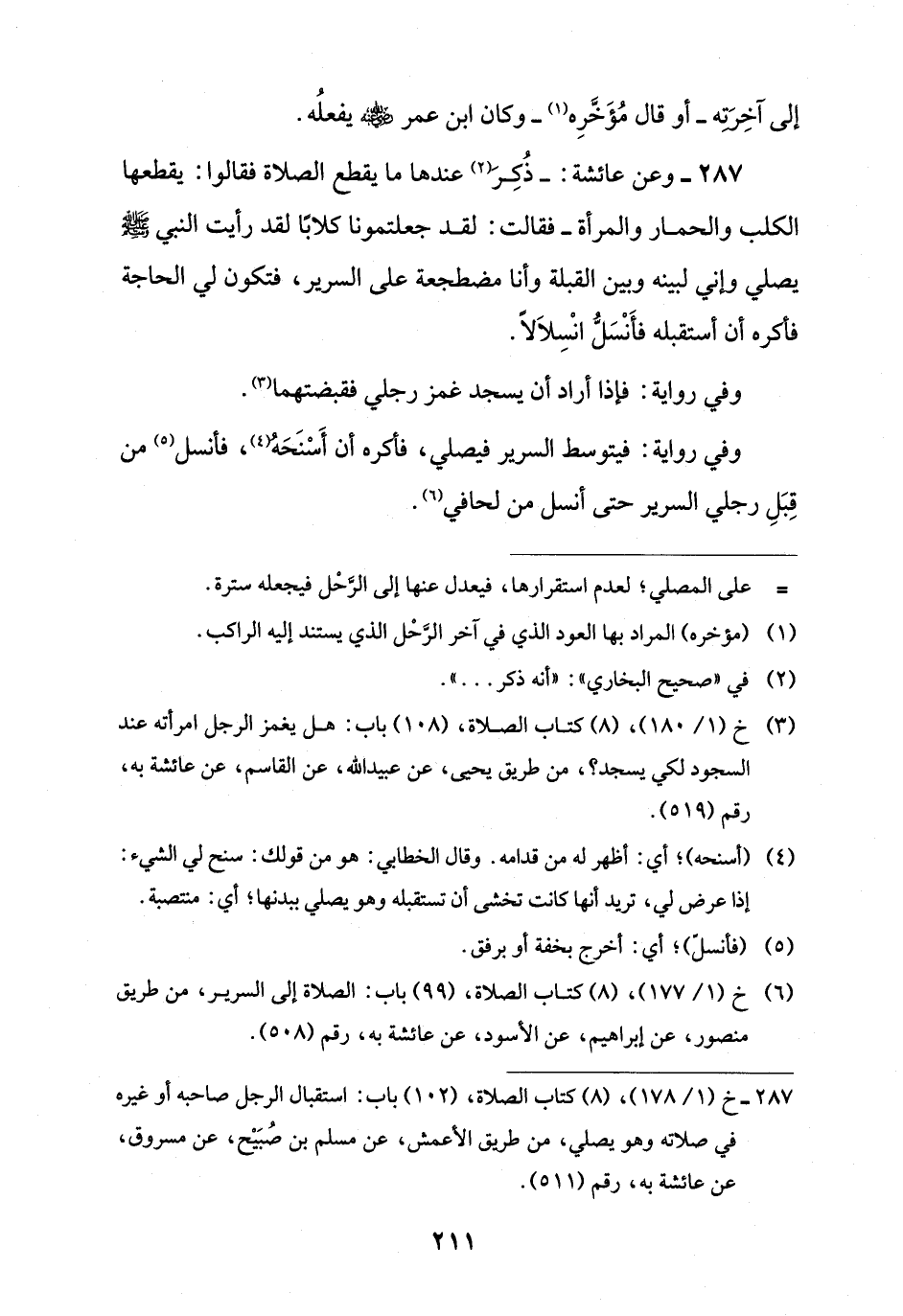 287 - وعن عائشة: -ذُكِرَ (¬2) عندها ما يقطع الصلاة فقالوا: يقطعها الكلب والحمار والمرأة- فقالت: لقد جعلتمونا كلابًا لقد رأيت النبي -صلى اللَّه عليه وسلم- يصلي وإني لبينه وبين القبلة وأنا مضطجعة على السرير، فتكون لي الحاجة فكره أن أستقبله فأَنْسَلُّ انْسِلَالًا.