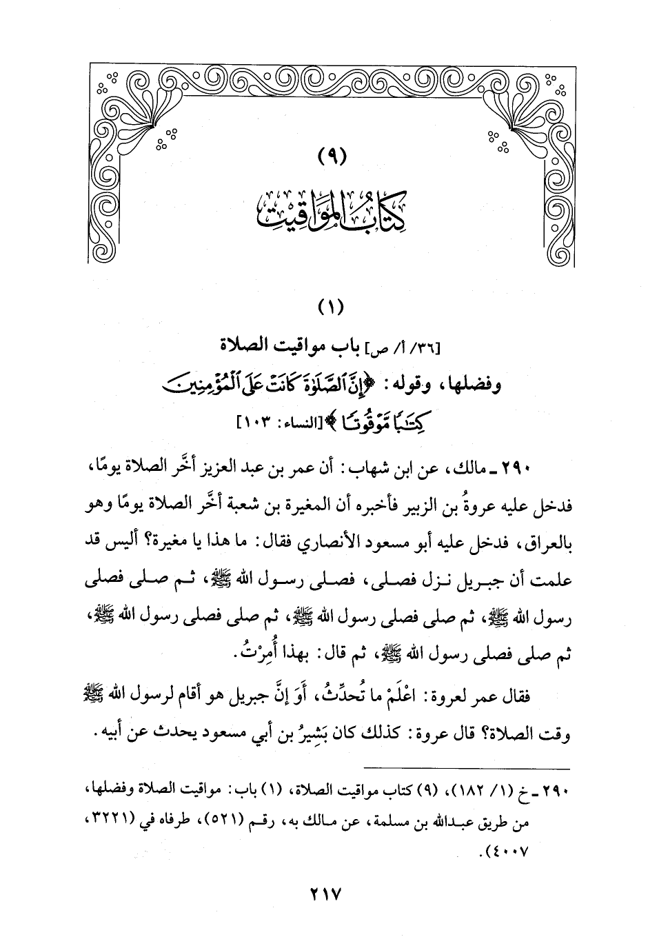 290 - مالك، عن ابن شهاب: أن عمر بن عبد العزيز أخَّر الصلاة يومًا، فدخل عليه عروةُ بن الزبير فأخبره أن المغيرة بن شعبة أخَّر الصلاة يومًا وهو بالعراق، فدخل عليه أبو مسعود الأنصاري فقال: ما هذا يا مغيرة؟ أليس قد علمت أن جبريل نزل فصلى، فصلى رسول اللَّه -صلى اللَّه عليه وسلم-، ثم صلى فصلى رسول اللَّه -صلى اللَّه عليه وسلم-، ثم صلى فصلى رسول اللَّه -صلى اللَّه عليه وسلم-، ثم صلى فصلى رسول اللَّه -صلى اللَّه عليه وسلم-، ثم صلى فصلى رسول اللَّه -صلى اللَّه عليه وسلم-، ثم قال: بهذا أُمِرْتُ.