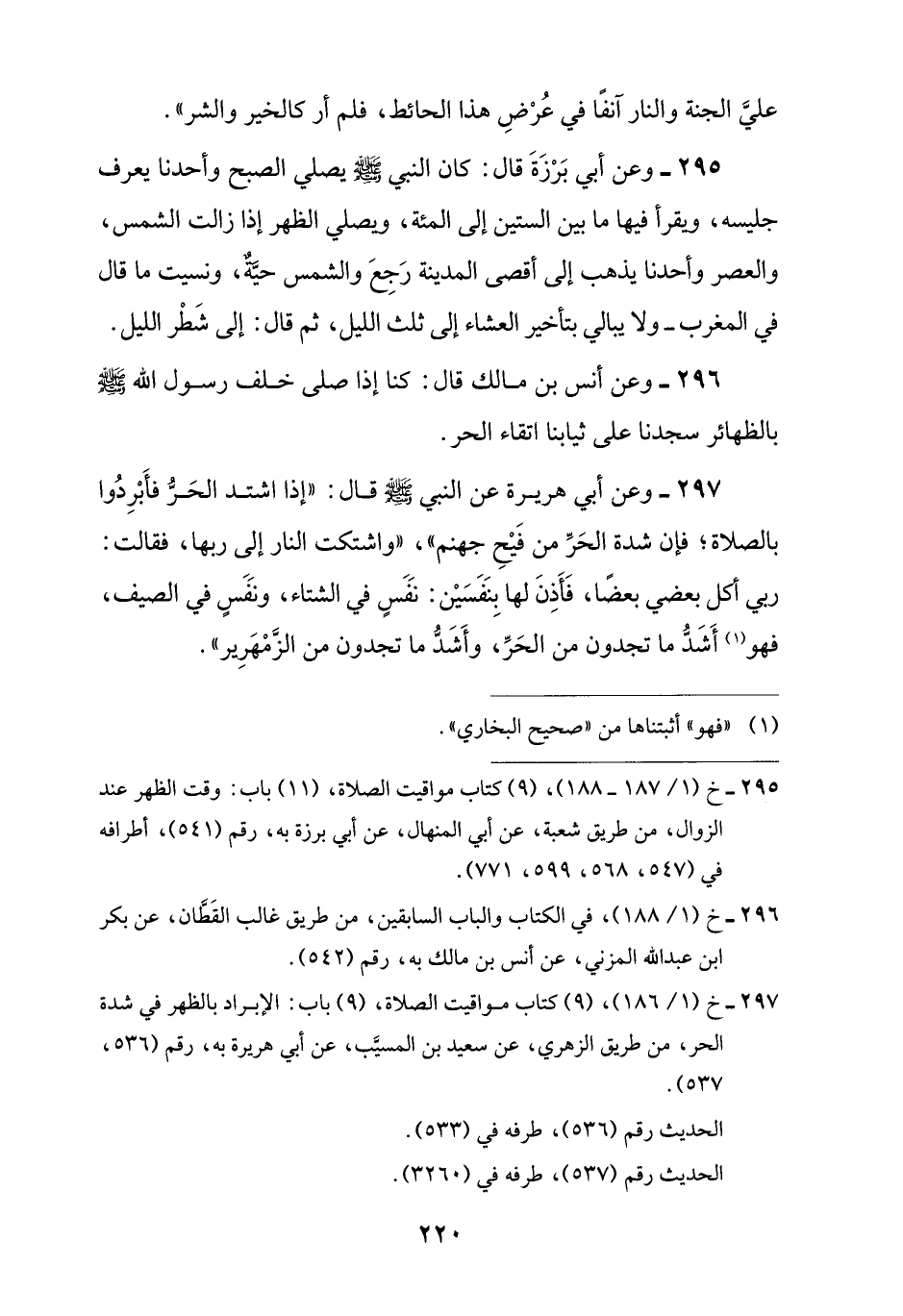 297 - خ (1/ 186)، (9) كتاب مواقيت الصلاة، (9) باب: الإبراد بالظهر في شدة الحر، من طريق الزهري، عن سعيد بن المسيَّب، عن أبي هريرة به، رقم (536، 537).