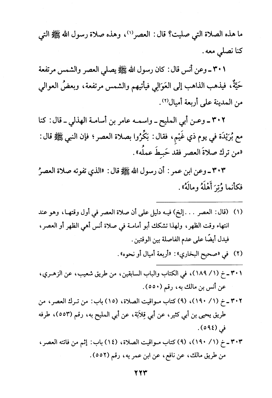 301 - وعن أنس قال: كان رسول اللَّه -صلى اللَّه عليه وسلم- يصلي العصر والشمس مرتفعة حَيَّةٌ، فيذهب الذاهب إلى العَوَالِي فيأتيهم والشمس مرتفعة، وبعضُ العوالي من المدينة على أربعة أميال (¬2).