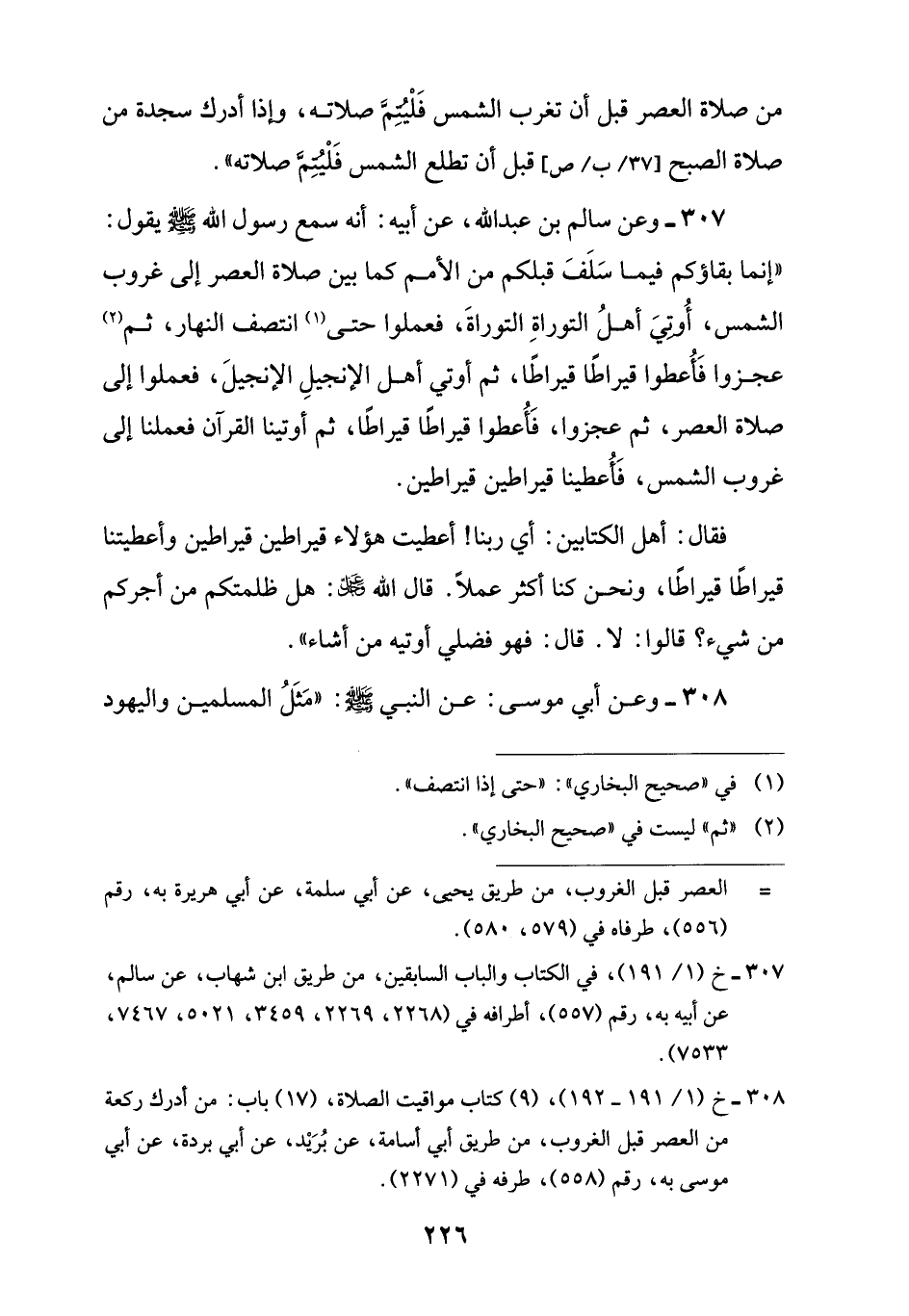 308 - خ (1/ 191 - 192)، (9) كتاب مواقيت الصلاة، (17) باب: من أدرك ركعة من العصر قبل الغروب، من طريق أبي أسامة، عن بُرَيْد، عن أبي بردة، عن أبي موسى به، رقم (558)، طرفه في (2271).