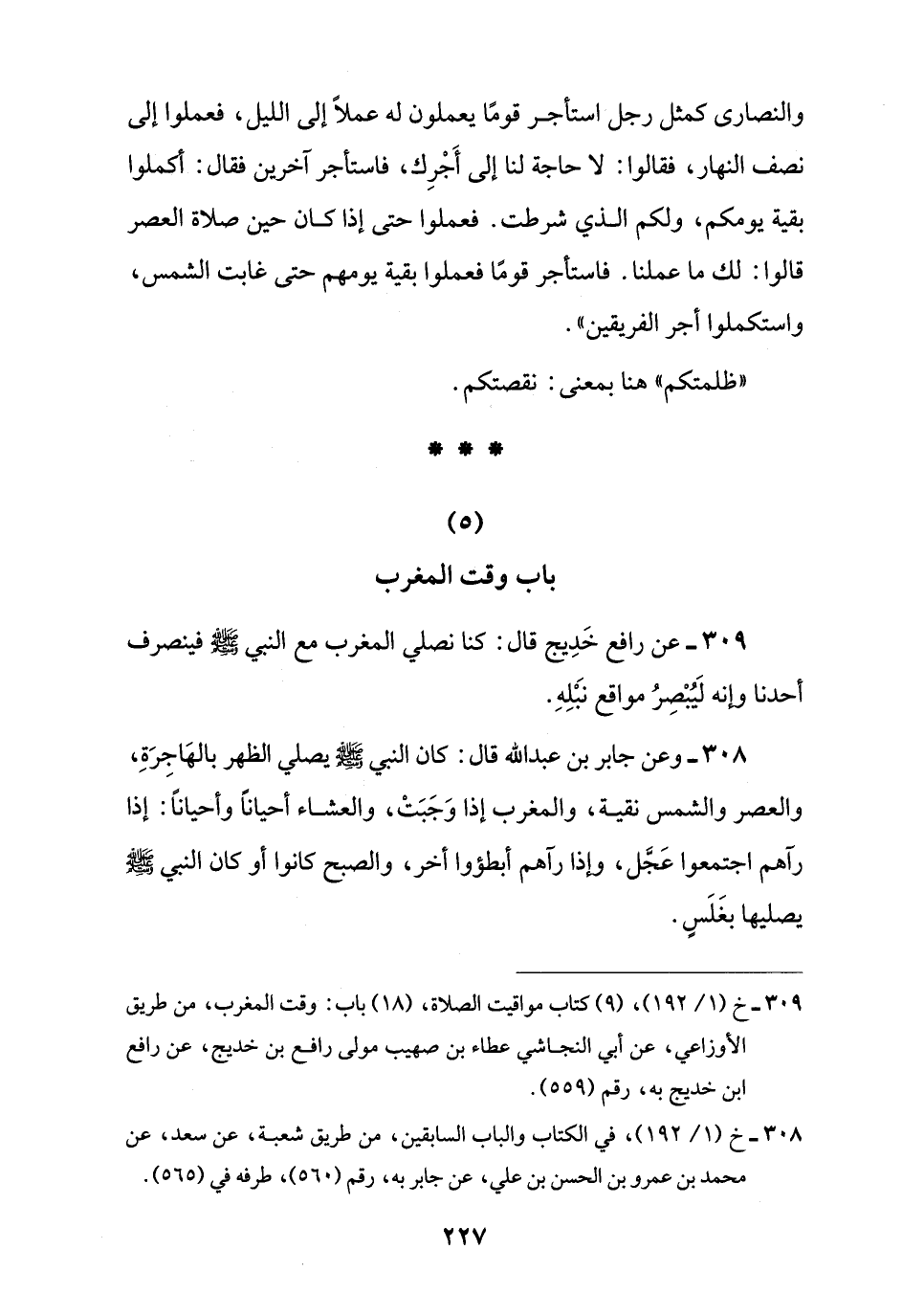 309 - عن رافع خَدِيج قال: كنا نصلي المغرب مع النبي -صلى اللَّه عليه وسلم- فينصرف أحدنا وإنه لَيُبْصِرُ مواقع نبلِهِ.