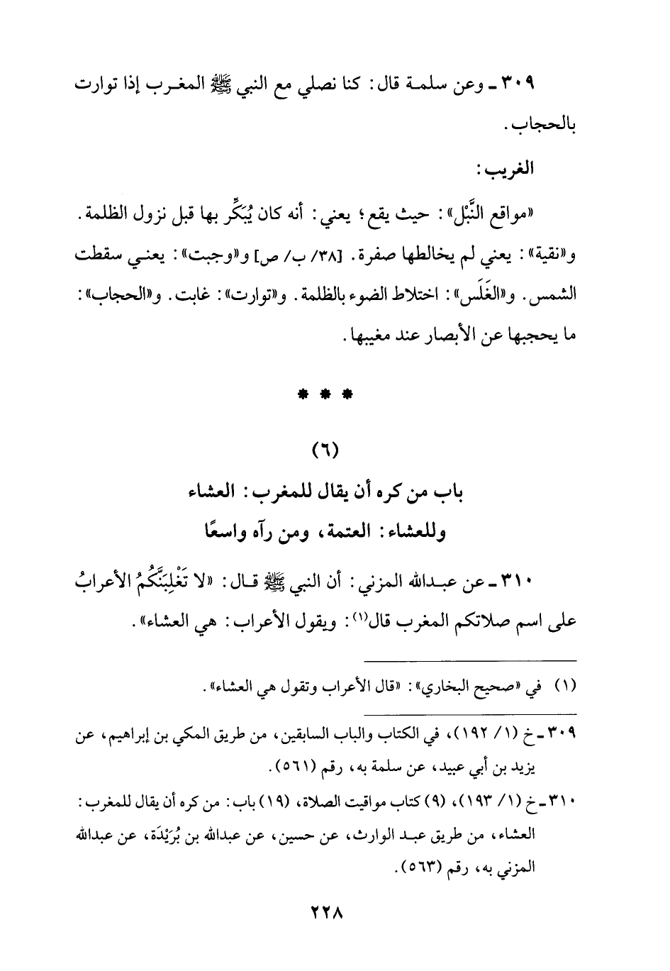 310 - عن عبد اللَّه المزني: أن النبي -صلى اللَّه عليه وسلم- قال: "لا تَغْلِبَنَّكمُ الأعرابُ على اسم صلاتكم المغرب قال (¬1): ويقول الأعراب: هي العشاء".