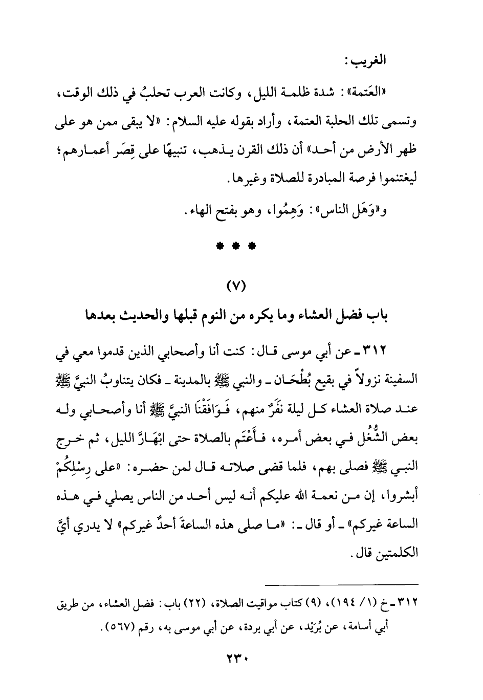 312 - عن أبي موسى قال: كنت أنا وأصحابي الذين قدموا معي في السفينة نزولًا في بقيع بُطْحَان -والنبي -صلى اللَّه عليه وسلم- بالمدينة- فكان يتناوبُ النبيَّ -صلى اللَّه عليه وسلم- عند صلاة العشاء كل ليلة نفًرٌ منهم، فَوَافَقْنَا النبيَّ -صلى اللَّه عليه وسلم- أنا وأصحابي وله بعض الشُّغُل في بعض أمره، فأَعْتَم بالصلاة حتى ابْهَارَّ الليل، ثم خرج النبي -صلى اللَّه عليه وسلم- فصلى بهم، فلما قضى صلاته قال لمن حضره: "على رِسْلِكُمْ أبشروا، إن من نعمة اللَّه عليكم أنه ليس أحد من الناس يصلي في هذه الساعة غيركم" -أو قال-: "ما صلى هذه الساعةَ أحدٌ غيركم" لا يدري أيَّ الكلمتين قال.