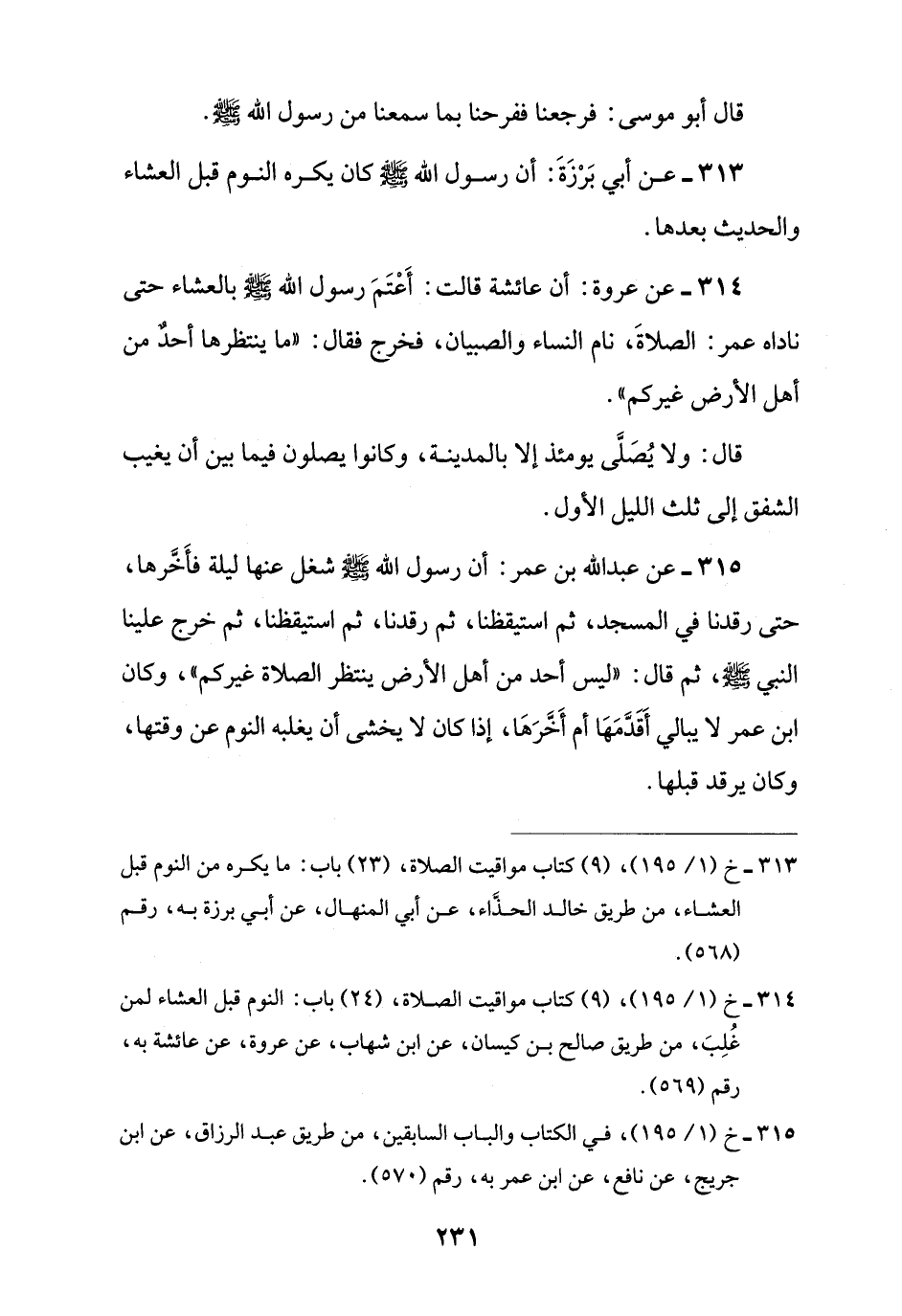 315 - عن عبد اللَّه بن عمر: أن رسول اللَّه -صلى اللَّه عليه وسلم- شغل عنها ليلة فأَخَّرها، حتى رقدنا في المسجد، ثم استيقظنا، ثم رقدنا، ثم استيقظنا، ثم خرج علينا النبي -صلى اللَّه عليه وسلم-، ثم قال: "ليس أحد من أهل الأرض ينتظر الصلاة غيركم"، وكان ابن عمر لا يبالي أَقَدَّمَهَا أم أَخَّرَهَا، إذا كان لا يخشى أن يغلبه النوم عن وقتها، وكان يرقد قبلها.
