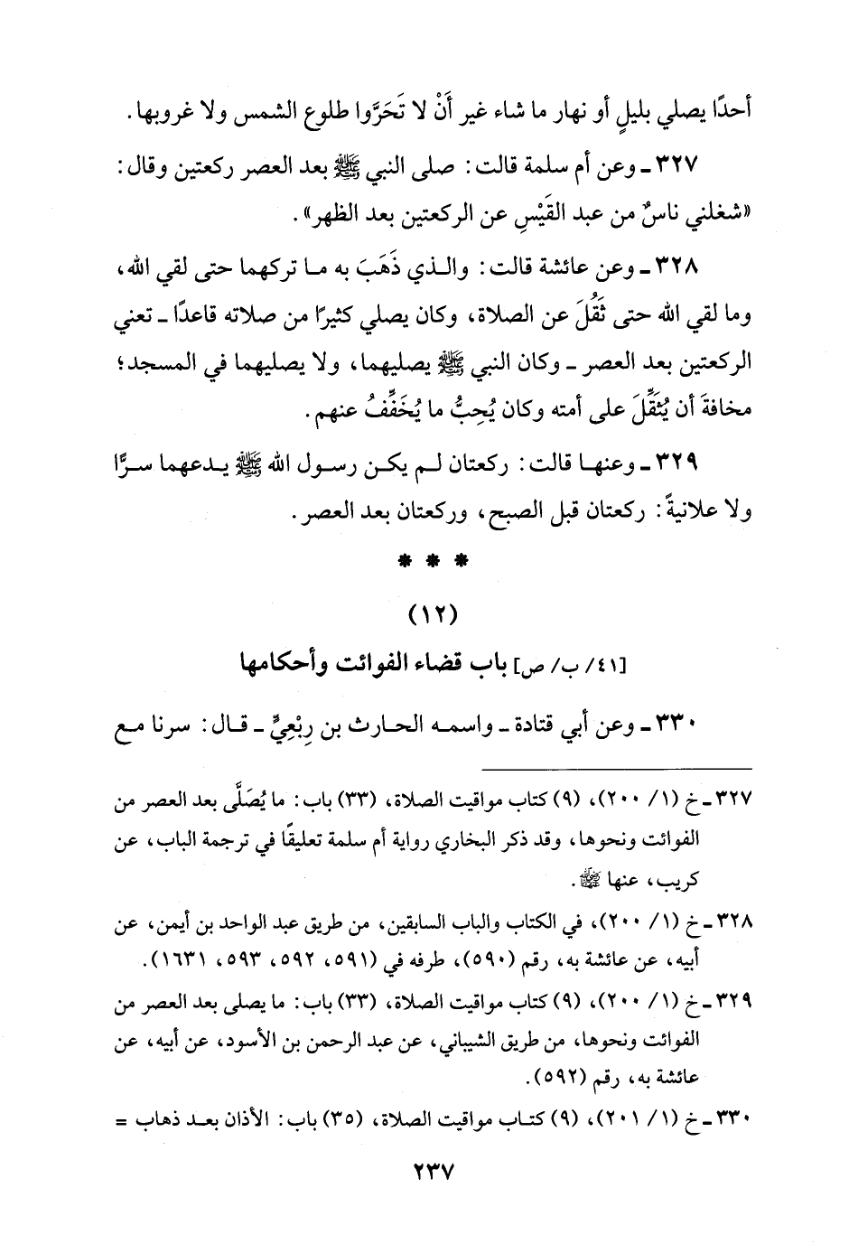 329 - وعنها قالت: ركعتان لم يكن رسول اللَّه -صلى اللَّه عليه وسلم- يدعهما سرًّا ولا علانيةً: ركعتان قبل الصبح، وركعتان بعد العصر.