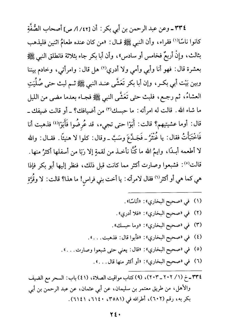 334 - خ (1/ 202 - 203)، (9) كتاب مواقيت الصلاة، (41) باب: السحر مع الضيف والأهل، من طريق معتمر بن سليمان، عن أبي عثمان، عن عبد الرحمن بن أبي بكر به، رقم (602)، أطرافه في (3581، 6140، 6141).