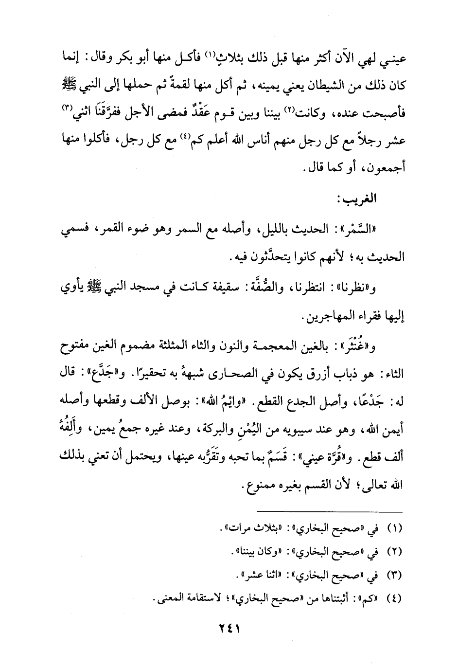 عيني لهي الآن أكثر منها قبل ذلك بثلاثٍ (¬1) فأكل منها أبو بكر وقال: إنما كان ذلك من الشيطان يعني يمينه، ثم أكل منها لقمة ثم حملها إلى النبي -صلى اللَّه عليه وسلم- فأصبحت عنده، وكانت (¬2) بيننا وبين قوم عَقْدٌ فمضى الأجل ففرَّقَنَا اثني (¬3) عشر رجلًا مع كل رجل منهم أناس اللَّه أعلم كم (¬4) مع كل رجل، فأكلوا منها أجمعون، أو كما قال.