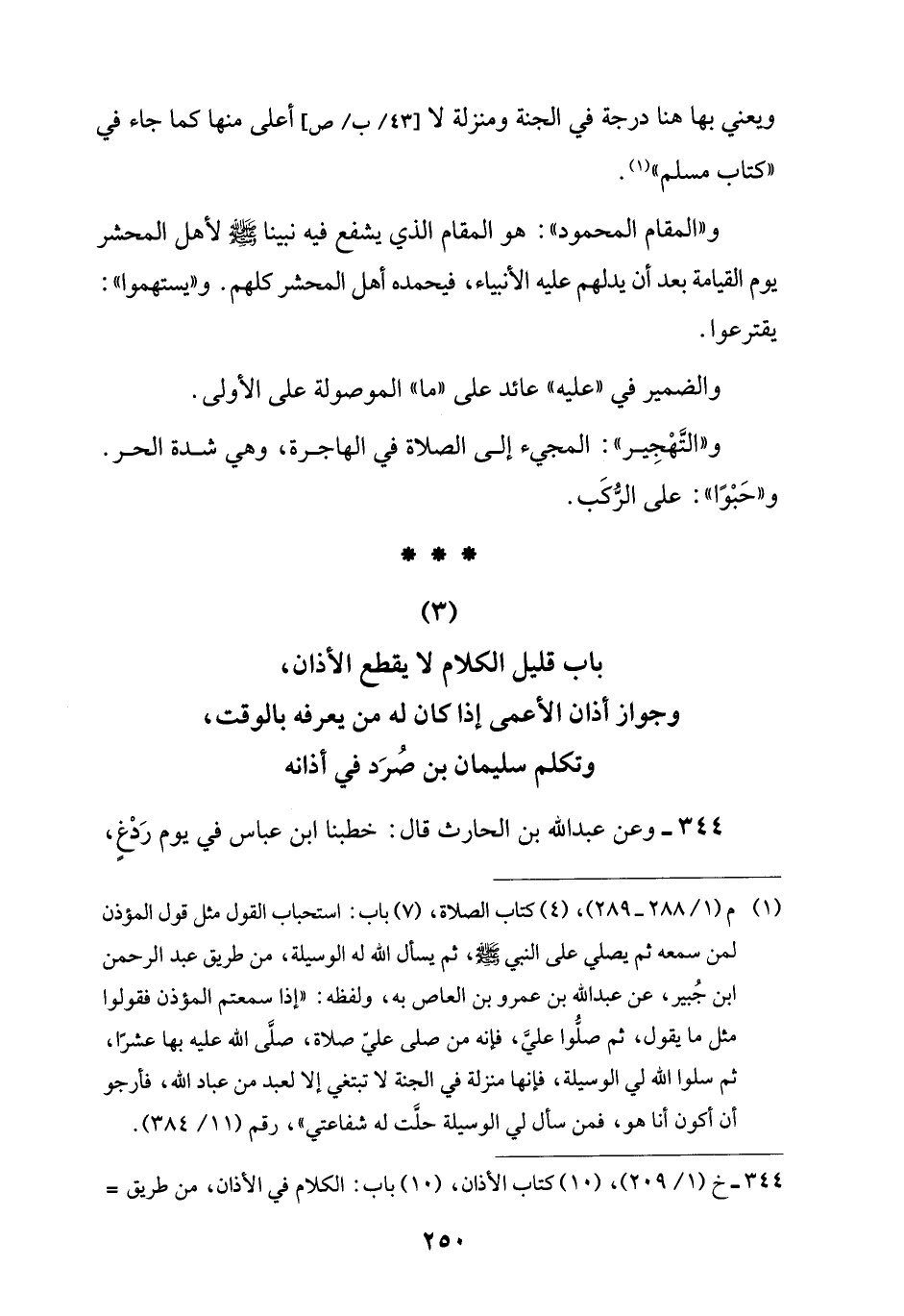 (3) باب قليل الكلام لا يقطع الأذان، وجواز أذان الأعمى إذا كان له من يعرفه بالوقت، وتكلم سليمان بن صُرَد في أذانه
