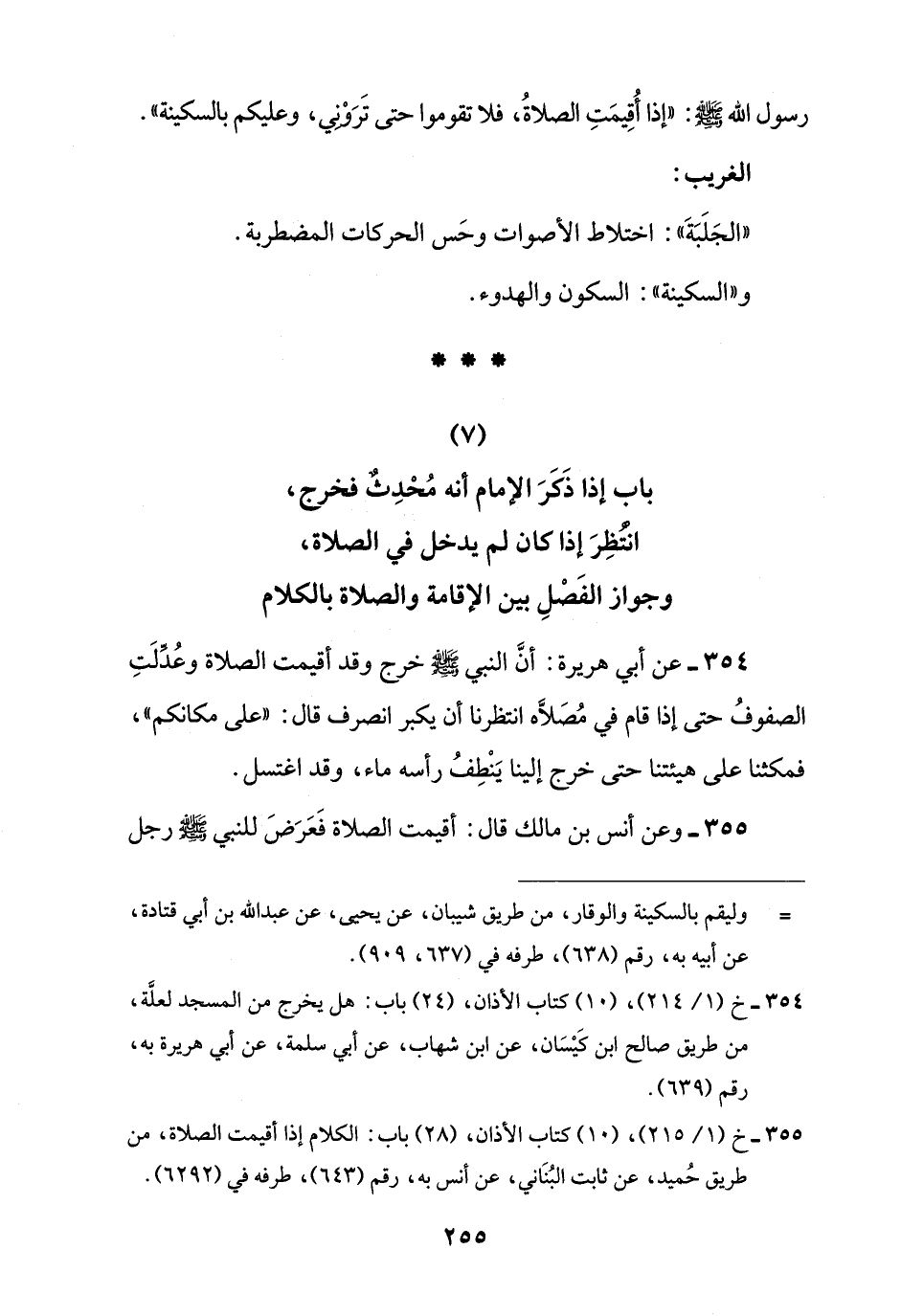 354 - عن أبي هريرة: أنَّ النبي -صلى اللَّه عليه وسلم- خرج وقد أقيمت الصلاة وعُدِّلَتِ الصفوفُ حتى إذا قام في مُصَلَّاه انتظرنا أن يكبر انصرف قال: "على مكانكم"، فمكثنا على هيئتنا حتى خرج إلينا يَنْطِفُ رأسه ماء، وقد اغتسل.