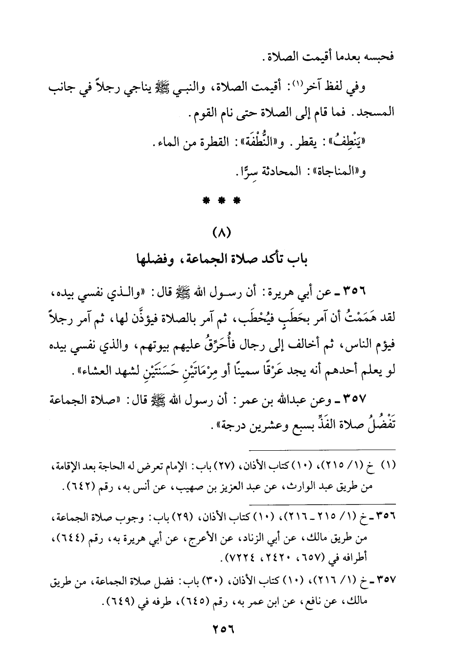 356 - خ (1/ 215 - 216)، (10) كتاب الأذان، (29) باب: وجوب صلاة الجماعة، من طريق مالك، عن أبي الزناد، عن الأعرج، عن أبي هريرة به، رقم (644)، أطرافه في (657، 2420، 7224).