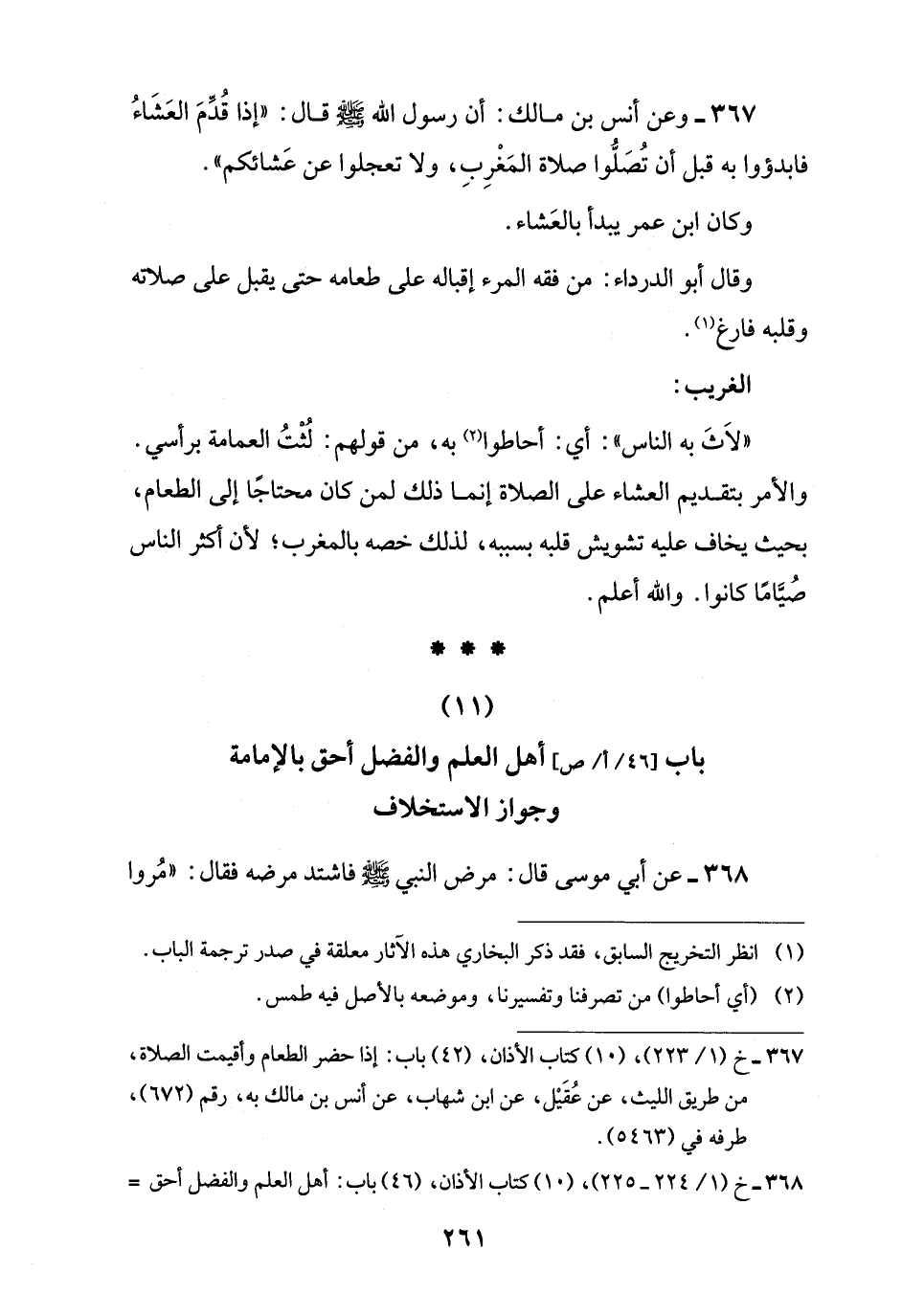 (11) باب أهل العلم والفضل أحق بالإمامة وجواز الاستخلاف
