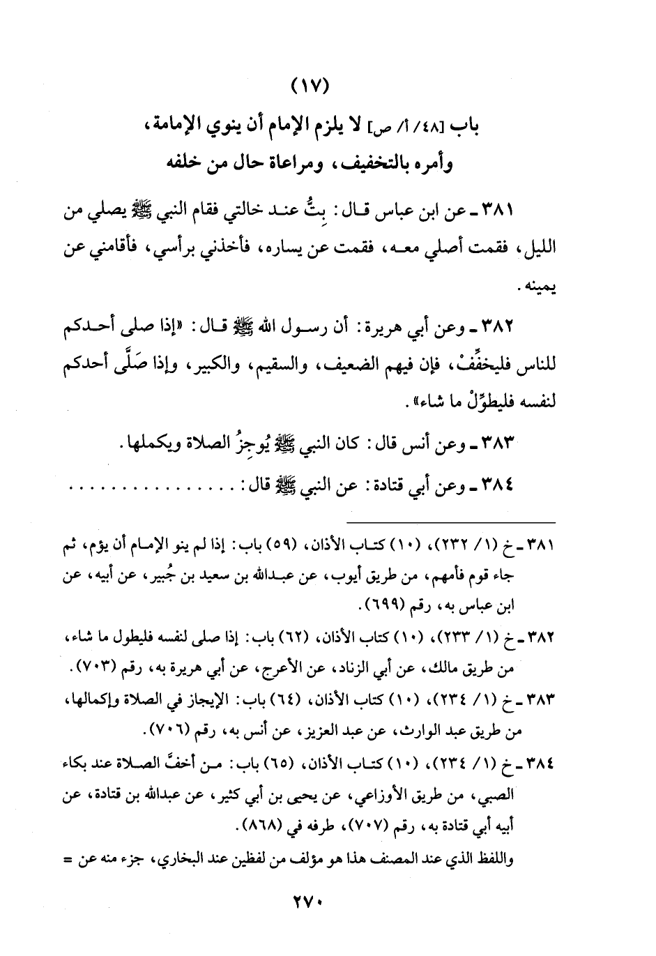 (17) باب لا يلزم الإمام أن ينوي الإمامة، وأمره بالتخفيف، ومراعاة حال من خلفه