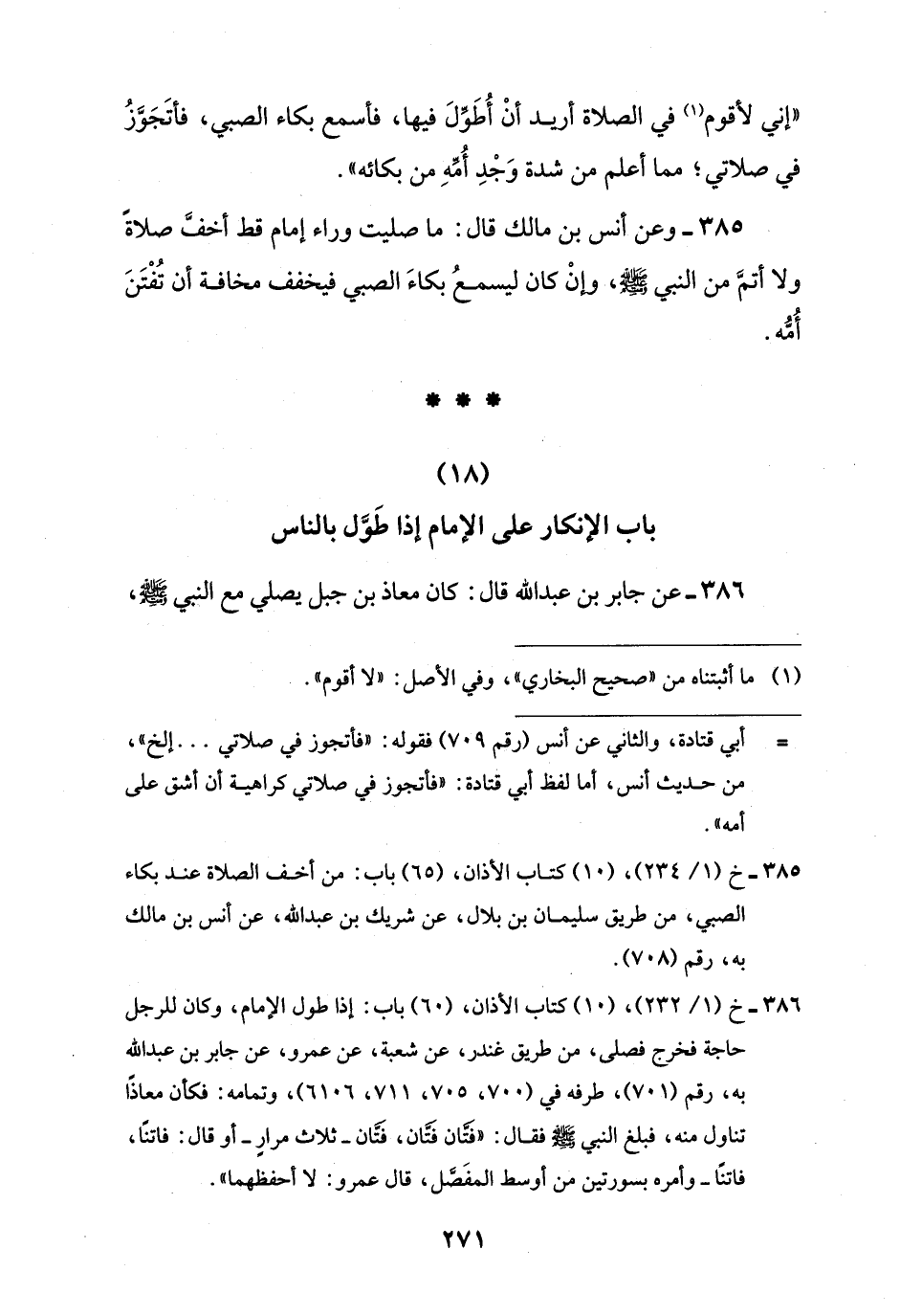 385 - وعن أنس بن مالك قال: ما صليت وراء إمام قط أخفَّ صلاةً ولا أتمَّ من النبي -صلى اللَّه عليه وسلم-، وإنْ كان ليسمعُ بكاءَ الصبي فيخفف مخافة أن تُفْتَنَ أُمُّه.