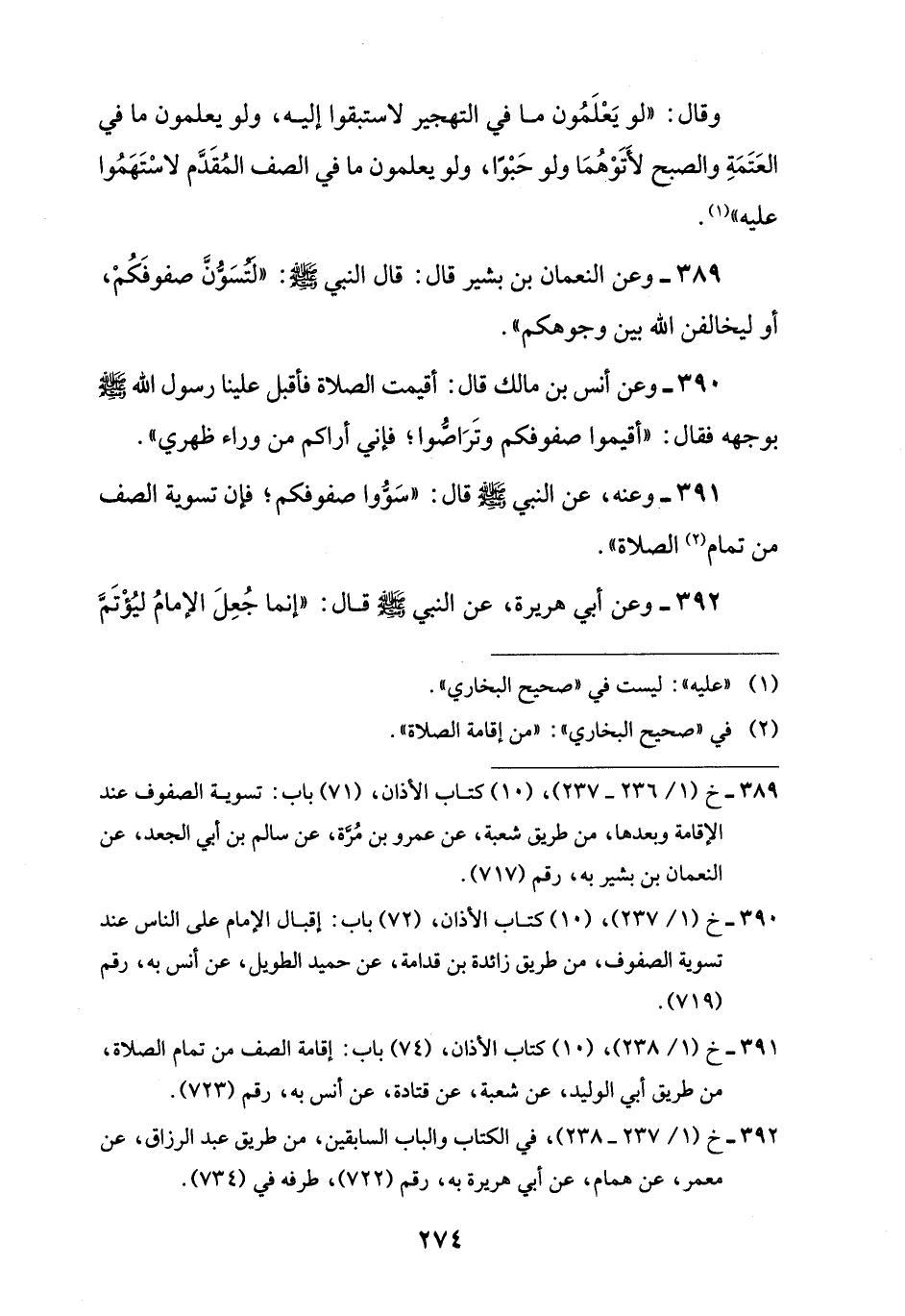 389 - وعن النعمان بن بشير قال: قال النبي -صلى اللَّه عليه وسلم-: "لَتُسَوُّنَّ صفوفَكُمْ، أو ليخالفن اللَّه بين وجوهكم".