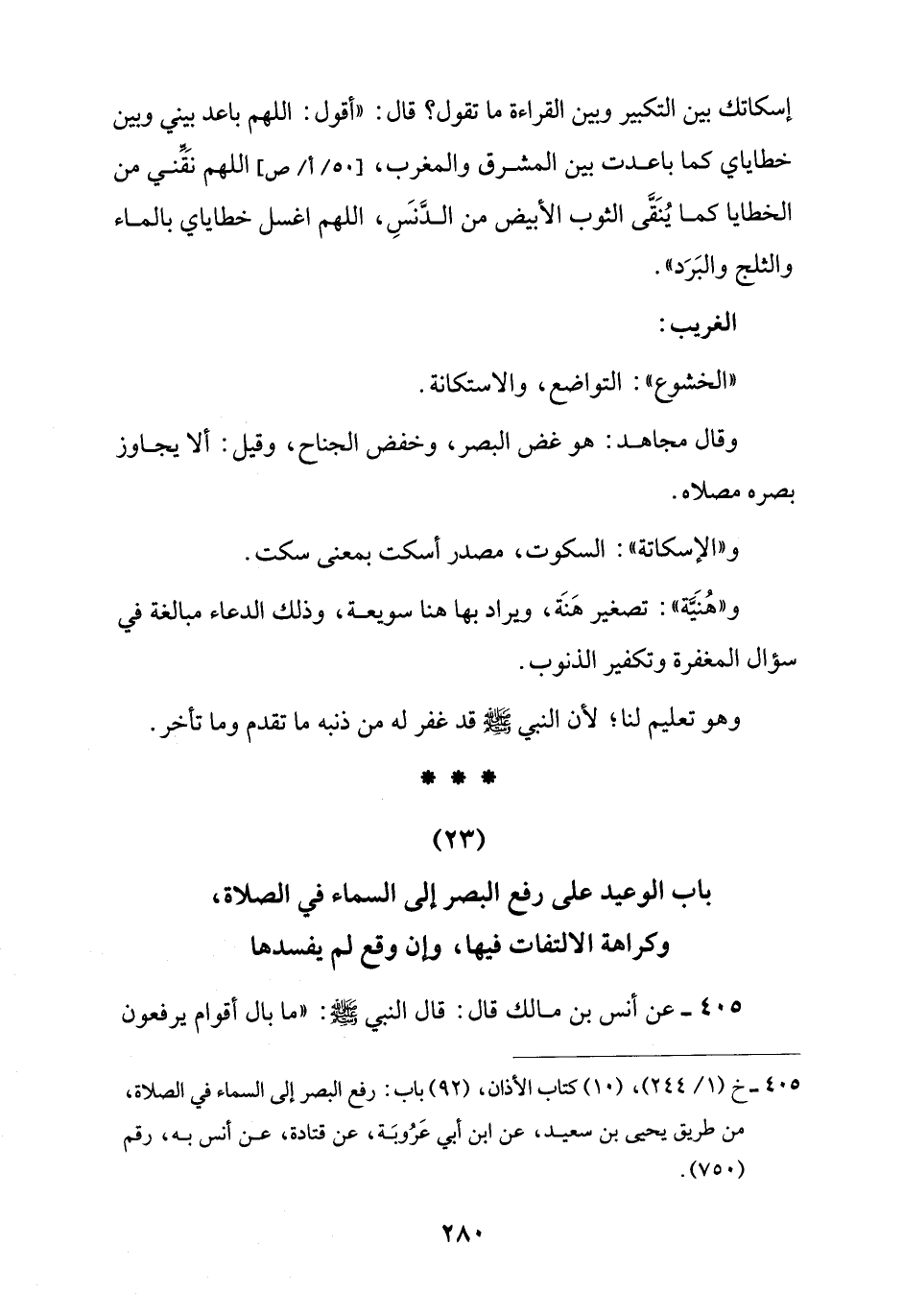 (23) باب الوعيد على رفع البصر إلى السماء في الصلاة، وكراهة الالتفات فيها، وإن وقع لم يفسدها