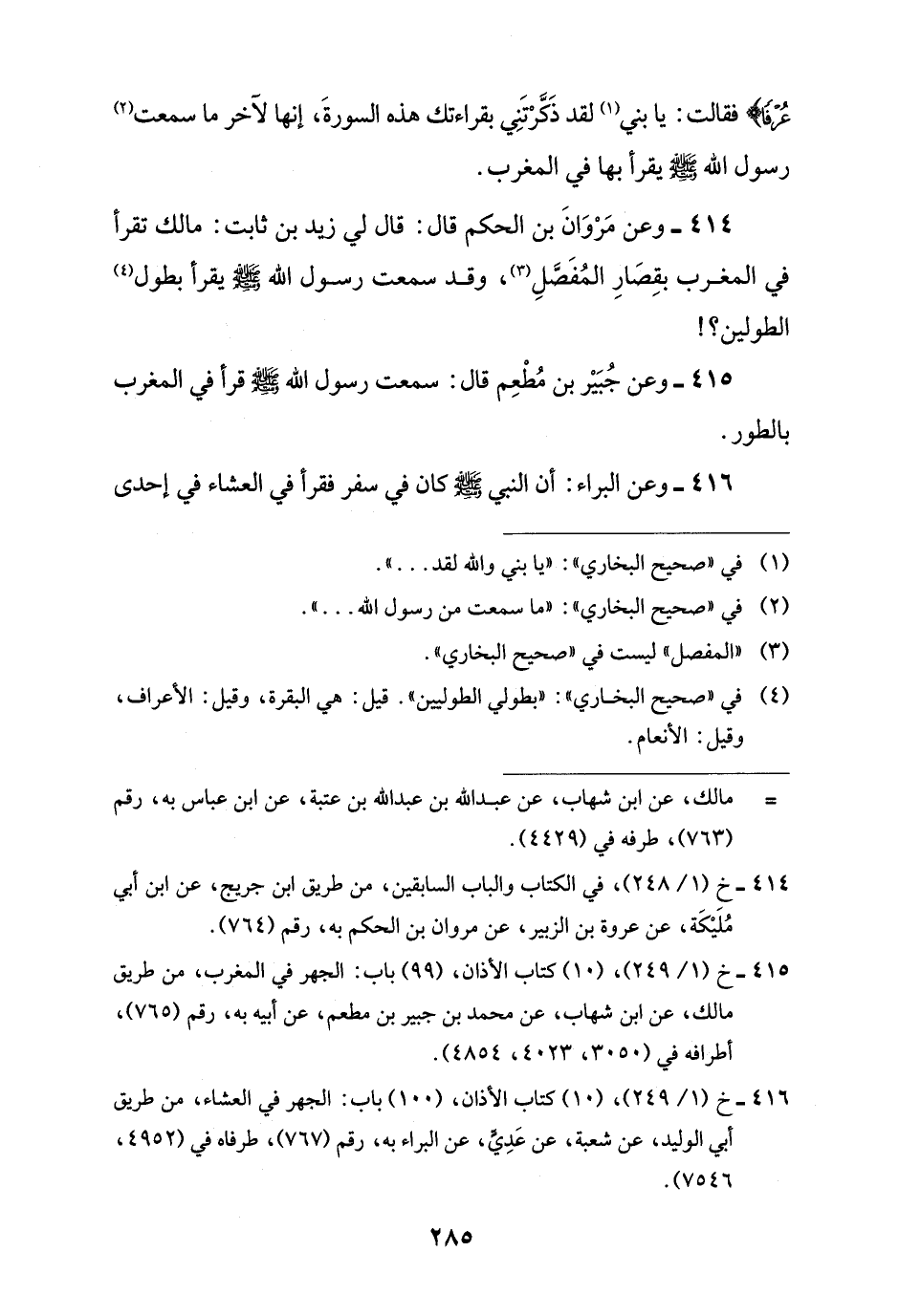 414 - وعن مَرْوَانَ بن الحكم قال: قال لي زيد بن ثابت: مالك تقرأ في المغرب بقِصَارِ المُفَصَّلِ (¬3)، وقد سمعت رسول اللَّه -صلى اللَّه عليه وسلم- يقرأ بطول (¬4) الطولين؟ !