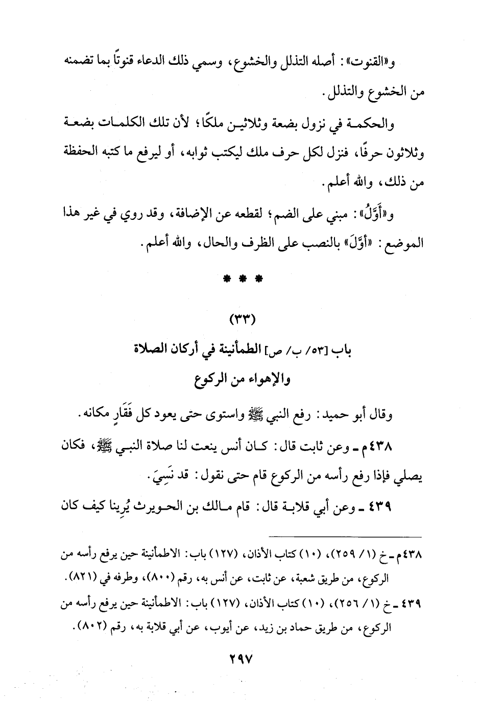 438 م - خ (1/ 259)، (10) كتاب الأذان، (127) باب: الطمأنينة حين يرفع رأسه من الركوع، من طريق شعبة، عن ثابت، عن أنس به، رقم (800)، وطرفه في (821).