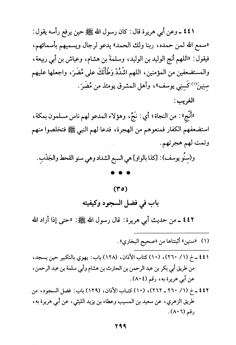 442 - خ (1/ 260 - 262)، (10) كتاب الأذان، (129) باب: فضل السجود، من طريق الزهري، عن سعيد بن المسيب وعطاء بن يزيد الليثي، عن أبي هريرة به، رقم (806).
