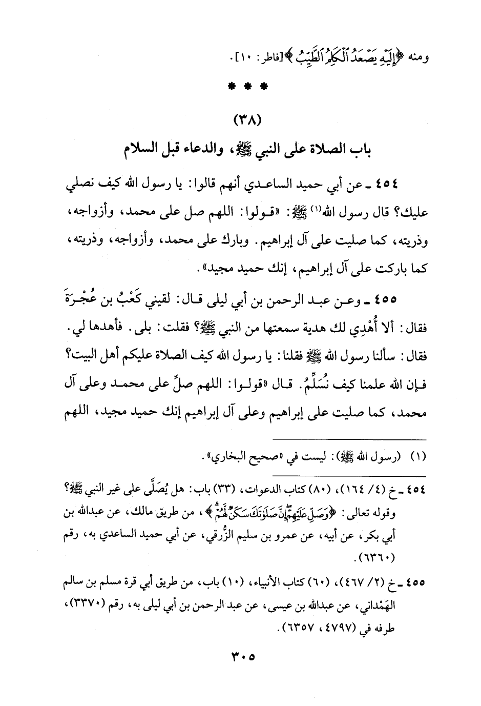 455 - وعن عبد الرحمن بن أبي ليلى قال: لقيني كَعْبُ بن عُجْرَةَ فقال: ألا أُهْدِي لك هدية سمعتها من النبي -صلى اللَّه عليه وسلم-؟ فقلت: بلى. فأهدها لي. فقال: سألنا رسول اللَّه -صلى اللَّه عليه وسلم- فقلنا: يا رسول اللَّه كيف الصلاة عليكم أهل البيت؟ فإن اللَّه علمنا كيف نسُلِّمُ. قال "قولوا: اللهم صلِّ على محمد وعلى آل محمد، كما صليت على إبراهيم وعلى آل إبراهيم إنك حميد مجيد، اللهم