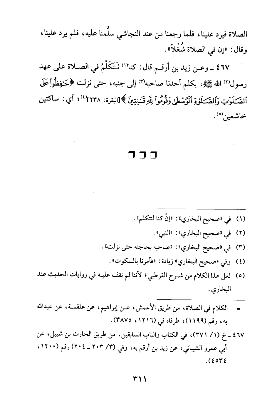 467 - وعن زيد بن أرقم قال: كنا (¬1) نَتَكَلَّمُ في الصلاة على عهد رسول (¬2) اللَّه -صلى اللَّه عليه وسلم-، يكلم أحدنا صاحبه (¬3) إلى جنبه، حتى نزلت {حَافِظُوا عَلَى الصَّلَوَاتِ وَالصَّلَاةِ الْوُسْطَى وَقُومُوا لِلَّهِ قَانِتِينَ} [البقرة: 238] (¬4)؛ أي: ساكتين خاشعين (¬5).