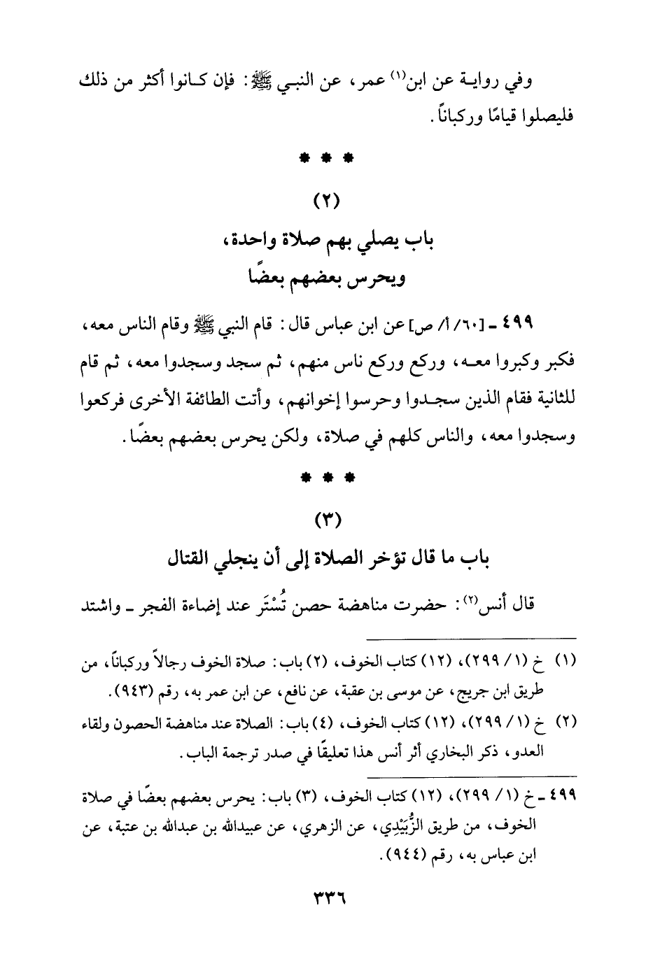 499 - عن ابن عباس قال: قام النبي -صلى اللَّه عليه وسلم- وقام الناس معه، فكبر وكبروا معه، وركع وركع ناس منهم، ثم سجد وسجدوا معه، ثم قام للثانية فقام الذين سجدوا وحرسوا إخوانهم، وأتت الطائفة الأخرى فركعوا وسجدوا معه، والناس كلهم في صلاة، ولكن يحرس بعضهم بعضًا.