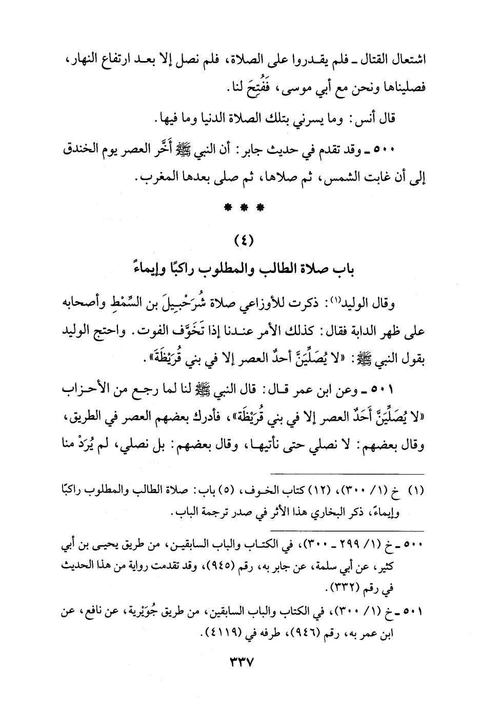 500 - وقد تقدم في حديث جابر: أن النبي -صلى اللَّه عليه وسلم- أَخَّر العصر يوم الخندق إلى أن غابت الشمس، ثم صلاها، ثم صلى بعدها المغرب.