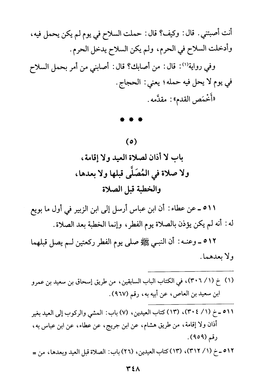 (5) باب لا أذان لصلاة العيد ولا إقامة، ولا صلاة في المُصَلَّى قبلها ولا بعدها، والخطبة قبل الصلاة