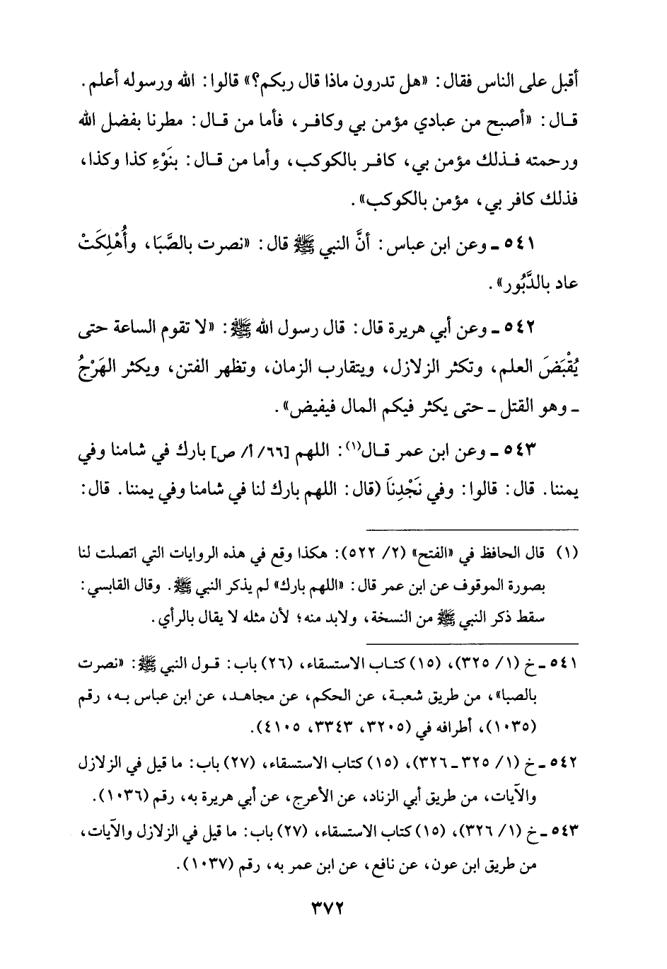 542 - خ (1/ 325 - 326)، (15) كتاب الاستسقاء، (27) باب: ما قيل في الزلازل والآيات، من طريق أبي الزناد، عن الأعرج، عن أبي هريرة به، رقم (1036).