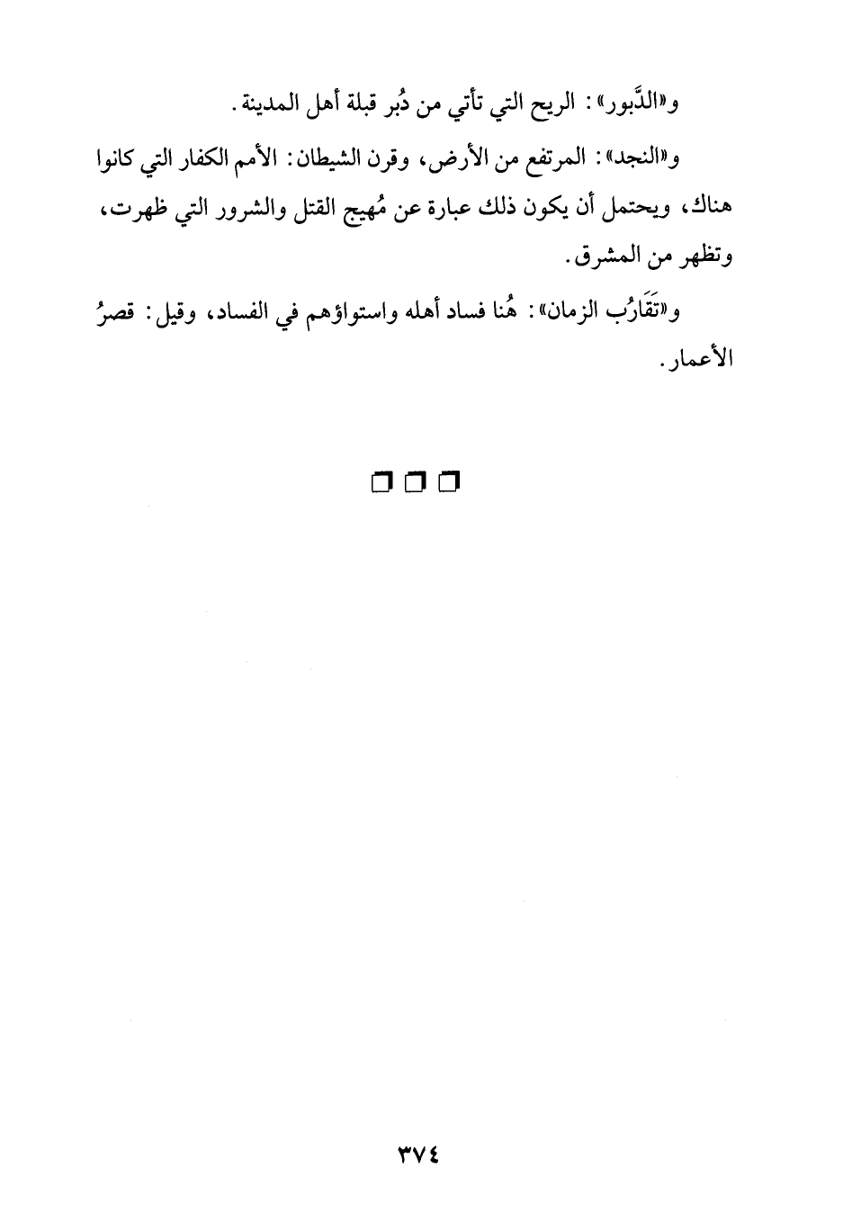 و"النجد": المرتفع من الأرض، وقرن الشيطان: الأمم الكفار التي كانوا هناك، ويحتمل أن يكون ذلك عبارة عن مُهيج القتل والشرور التي ظهرت، وتظهر من المشرق.