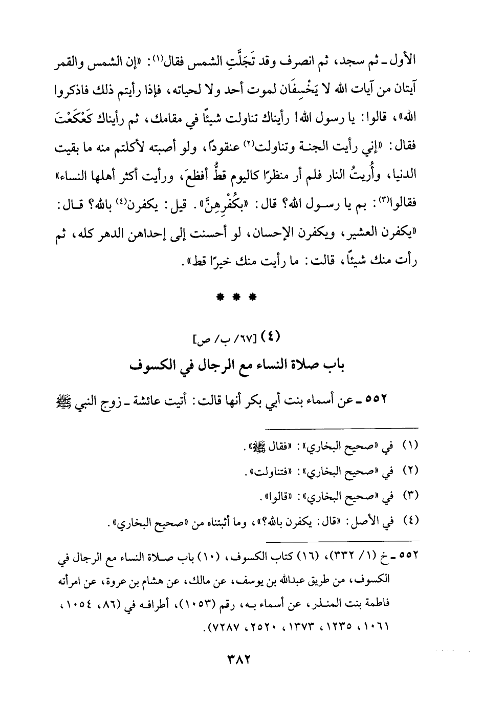 552 - خ (1/ 332)، (16) كتاب الكسوف، (10) باب صلاة النساء مع الرجال في الكسوف، من طريق عبد اللَّه بن يوسف، عن مالك، عن هشام بن عروة، عن امرأته فاطمة بنت المنذر، عن أسماء به، رقم (1053)، أطرافه في (86، 1054، 1061، 1235، 1373، 2520، 7287).