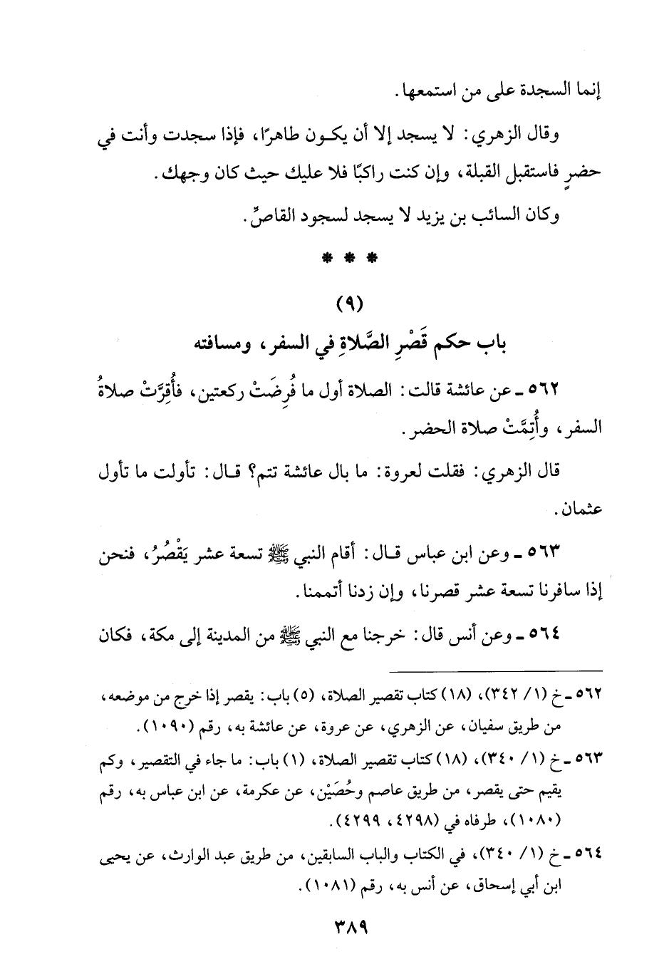 563 - وعن ابن عباس قال: أقام النبي -صلى اللَّه عليه وسلم- تسعة عشر يَقْصُرُ، فنحن إذا سافرنا تسعة عشر قصرنا، وإن زدنا أتممنا.