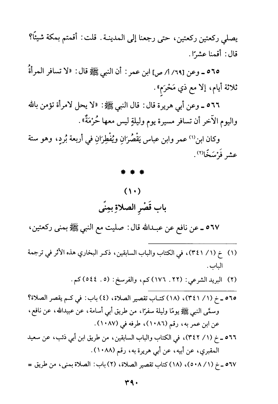 565 - خ (1/ 341)، (18) كتاب تقصير الصلاة، (4) باب: في كم يقصر الصلاة؟ وسمَّى النبي -صلى اللَّه عليه وسلم- يومًا وليلة سفرًا، من طريق أبي أسامة، عن عبيد اللَّه، عن نافع، عن ابن عمر به، رقم (1086)، طرفه في (1087).