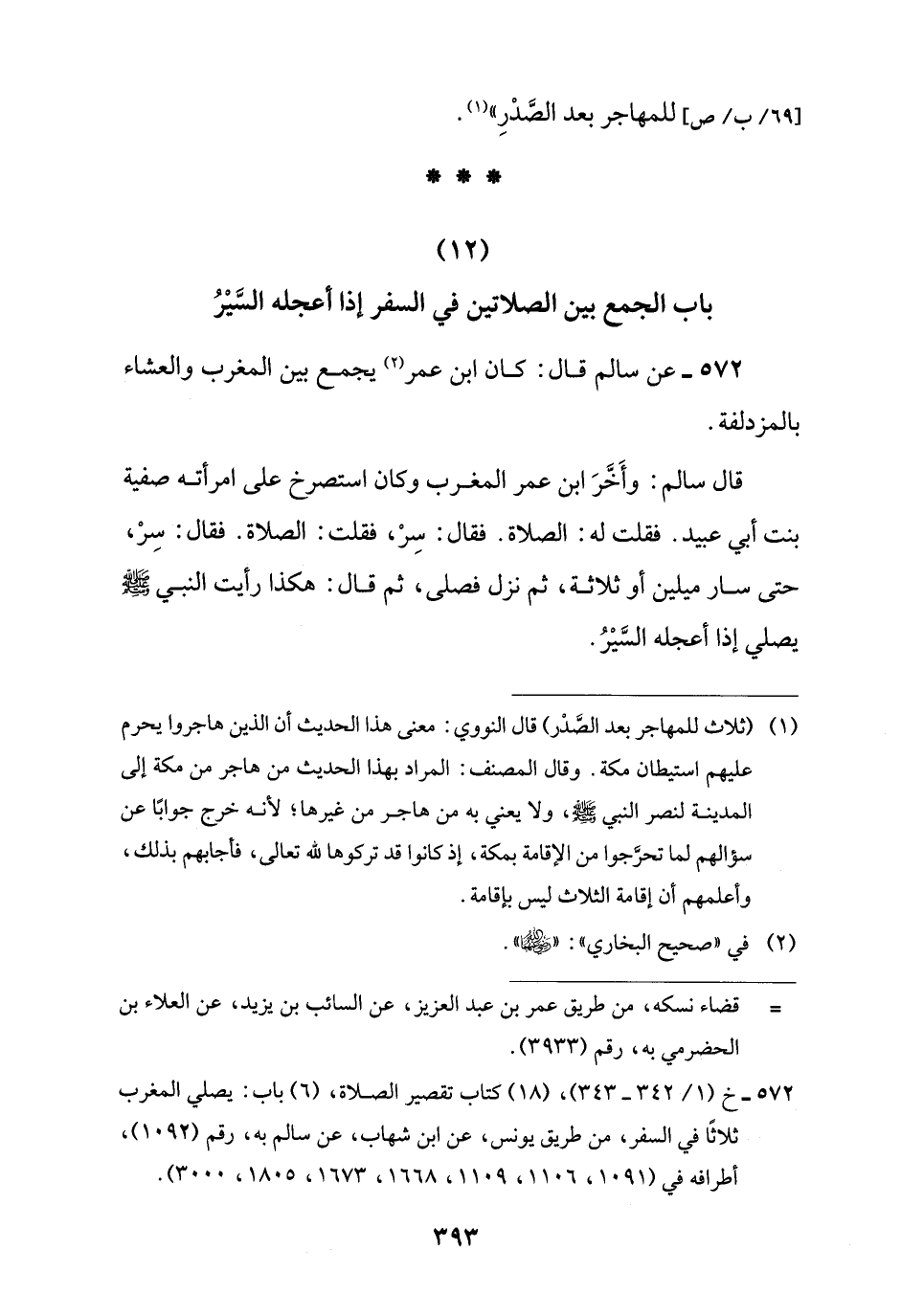 قال سالم: وأَخَّرَ ابن عمر المغرب وكان استصرخ على امرأته صفية بنت أبي عبيد. فقلت له: الصلاة. فقال: سِرْ، فقلت: الصلاة. فقال: سِرْ، حتى سار ميلين أو ثلاثة، ثم نزل فصلى، ثم قال: هكذا رأيت النبي -صلى اللَّه عليه وسلم- يصلي إذا أعجله السَّيْرُ.