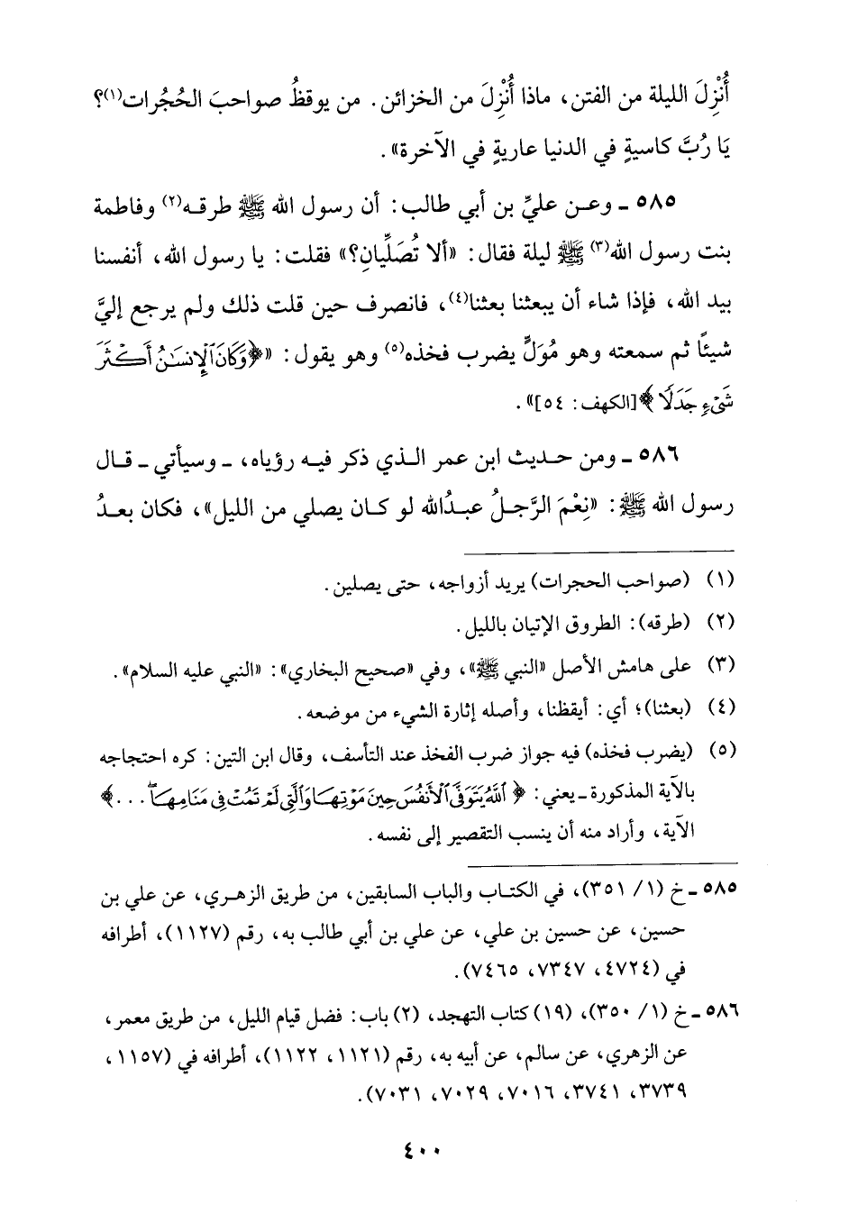 585 - وعن عليِّ بن أبي طالب: أن رسول اللَّه -صلى اللَّه عليه وسلم- طرقه (¬2) وفاطمة بنت رسول اللَّه (¬3) -صلى اللَّه عليه وسلم- ليلة فقال: "ألا تُصَلِّيانِ؟ " فقلت: يا رسول اللَّه، أنفسنا بيد اللَّه، فإذا شاء أن يبعثنا بعثنا (¬4)، فانصرف حين قلت ذلك ولم يرجع إليَّ شيئًا ثم سمعته وهو مُوَلٍّ يضرب فخذه (¬5) وهو يقول: " {وَكَانَ الْإِنْسَانُ أَكْثَرَ شَيْءٍ جَدَلًا} [الكهف: 54] ".