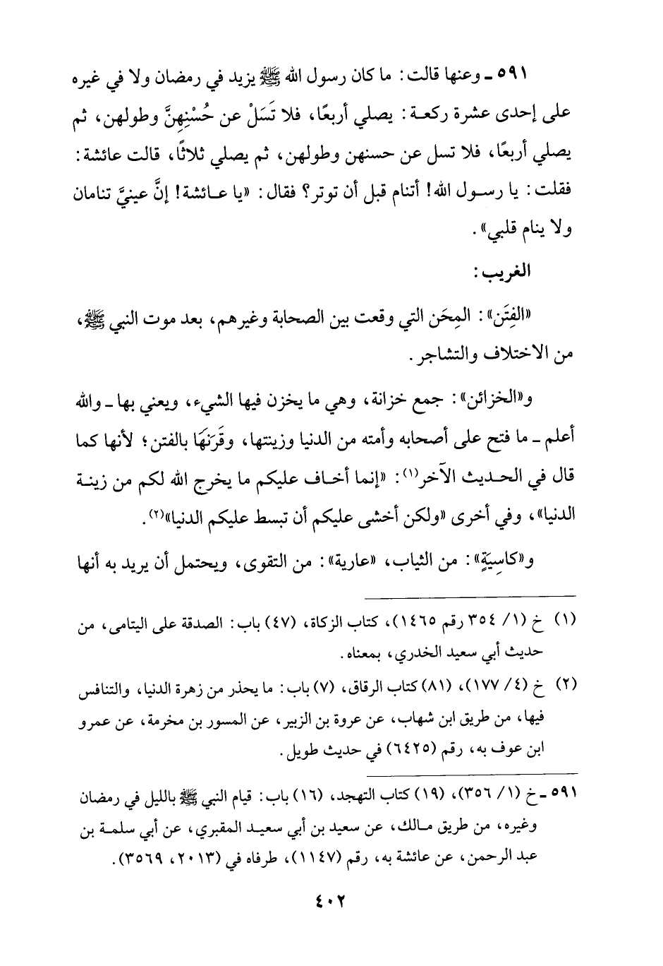 591 - وعنها قالت: ما كان رسول اللَّه -صلى اللَّه عليه وسلم- يزيد في رمضان ولا في غيره على إحدى عشرة ركعة: يصلي أربعًا، فلا تَسَلْ عن حُسْنِهِنَّ وطولهن، ثم يصلي أربعًا، فلا تسل عن حسنهن وطولهن، ثم يصلي ثلاثًا، قالت عائشة: فقلت: يا رسول اللَّه! أتنام قبل أن توتر؟ فقال: "يا عائشة! إنَّ عينيَّ تنامان ولا ينام قلبي".