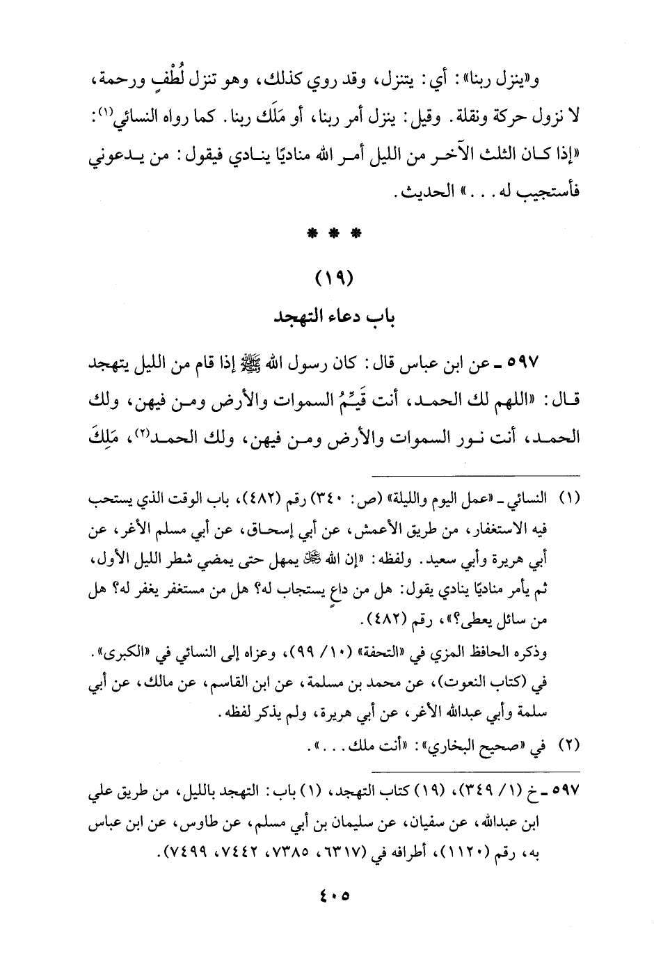 597 - عن ابن عباس قال: كان رسول اللَّه -صلى اللَّه عليه وسلم- إذا قام من الليل يتهجد قال: "اللهم لك الحمد، أنت قَيِّمُ السموات والأرض ومن فيهن، ولك الحمد، أنت نور السموات والأرض ومن فيهن، ولك الحمد (¬2)، مَلِكَ